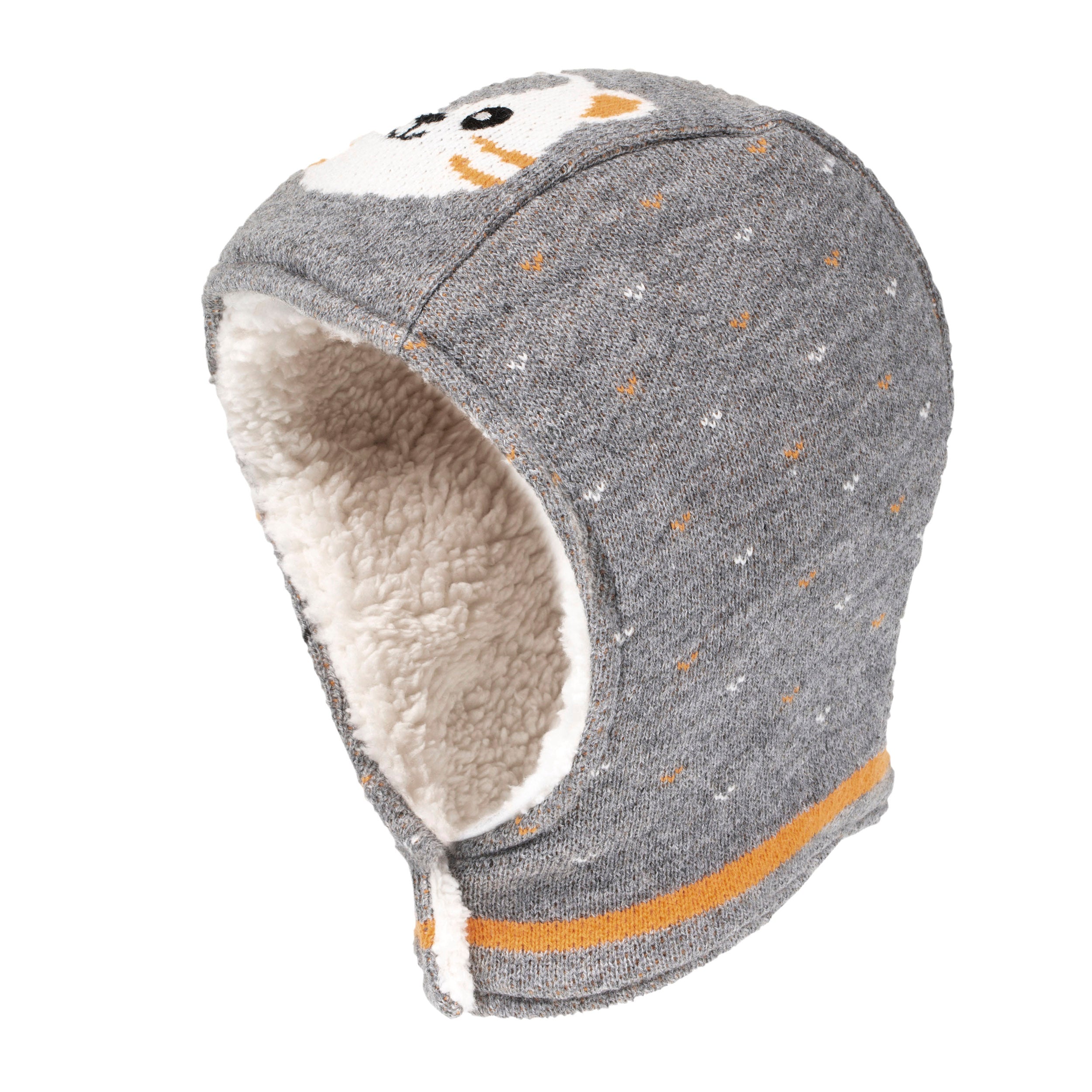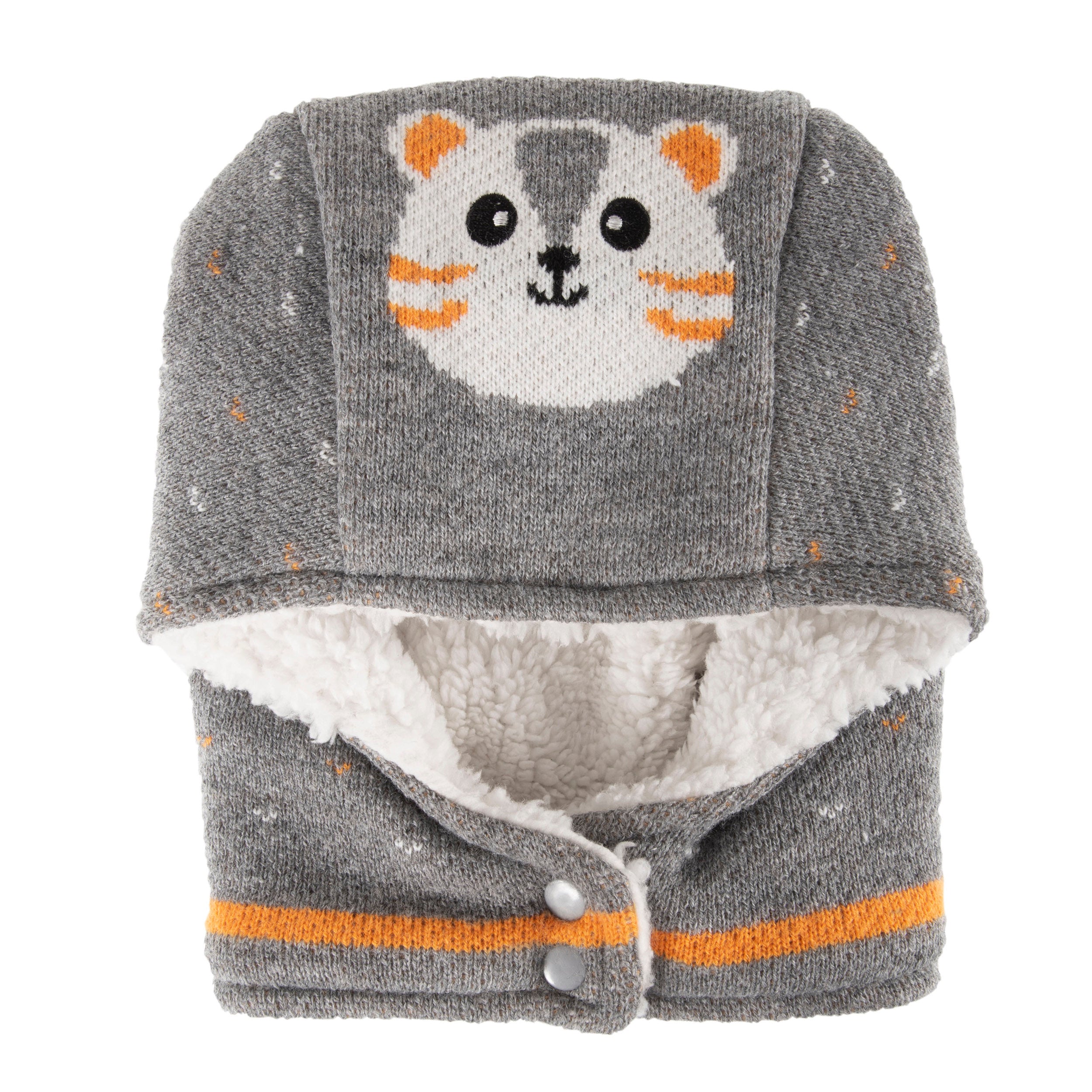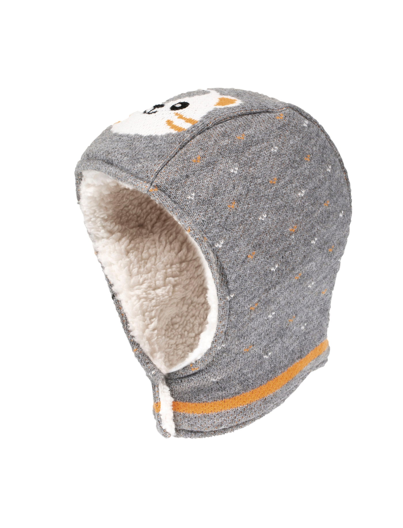 Cagoule enfant avec un motif ourson en maille, doublée imitation fourrure pour une protection contre le froid et un meilleur confort. Se maintient au niveau du cou avec 2 boutons. Pour enfant taille 2 ans.