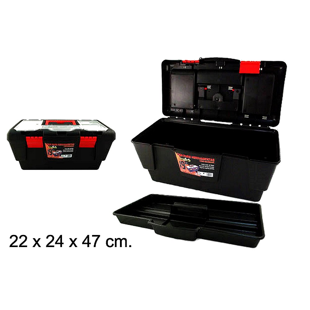 Boîte à outils 47 cm 2 larges attaches pour éviter les ouvertures intempestives en cas de chute. 3 organiseurs sur le couvercle. Plateau porte-outils amovible sur toute la longueur de la boite pour faciliter le rangement des longs outils (scie, niveau). Idéal pour le bricolage , la pêche Dimensions : 47 x 22 x 24 cm