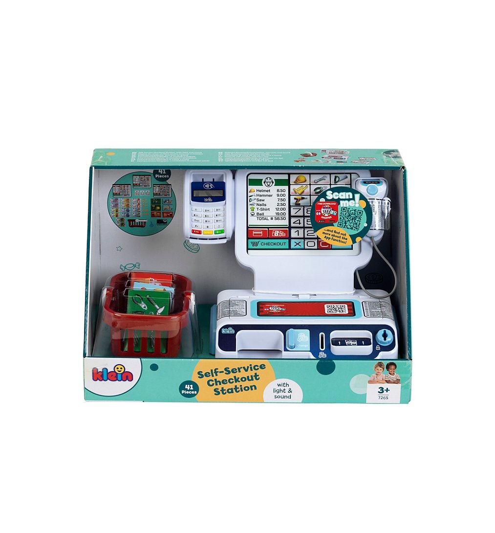 Caisse enregistreuse libre-service moderne composée d'un écran rétroéclairé avec 3 fiches à échanger (pour être soit au supermarché, au magasin de bricolage ou au restaurant), d'un terminal de paiement sonore avec clavier rétroéclairé, d'une carte bancaire à insérer et 3 tickets de caisse, d'un scanner sonore et lumineux, d'un tiroir-caisse verrouillable (utilisable avec ou sans la clé fournie), d'un monnayeur pour l'insertion de billets et de pièces de monnaie factices fournis, d'un panier de courses, de 6 boîtes factices à scanner. Piles requises : 2 x R03-AAA - Non fournies. A partir de 3 ans