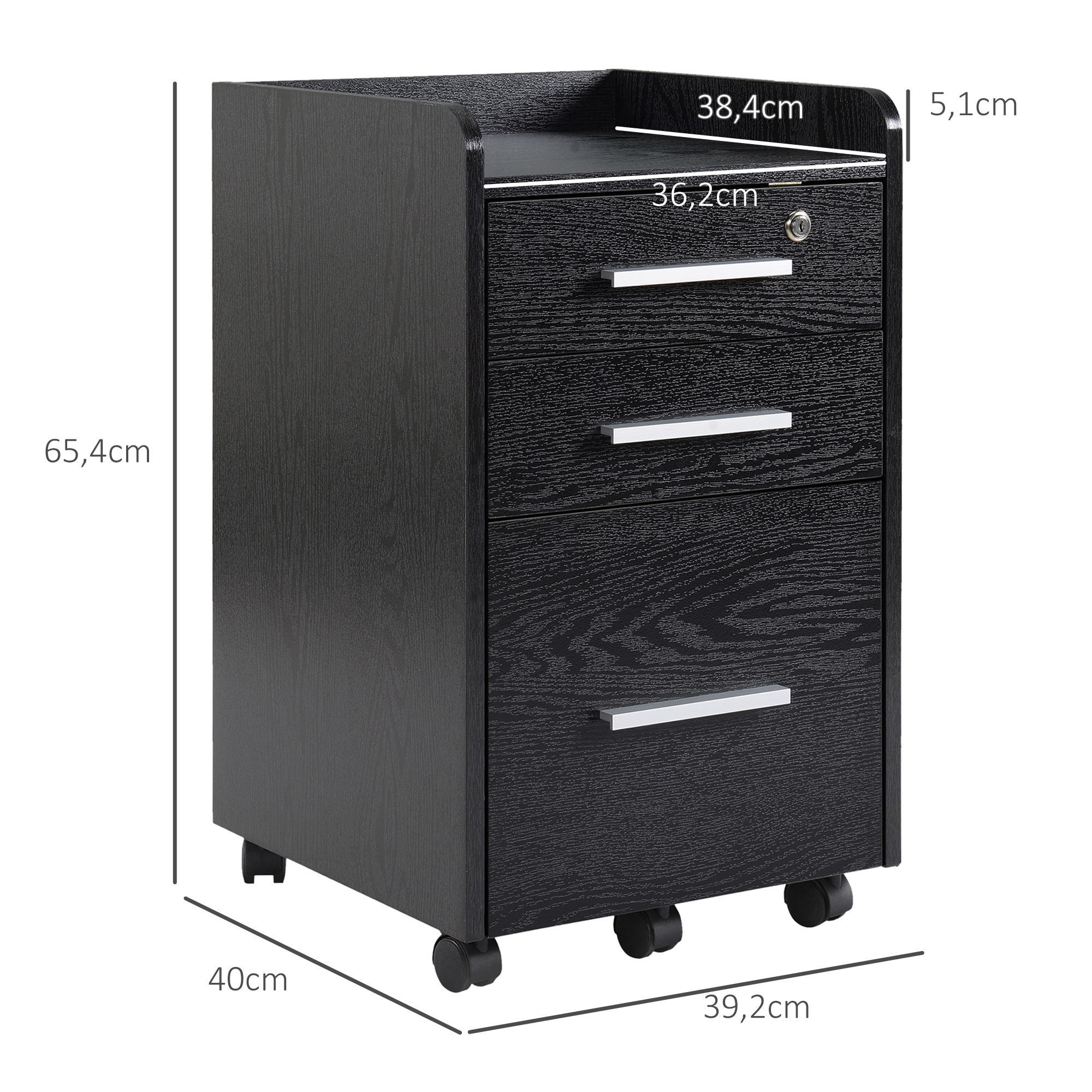 | Libellé | Caisson de bureau rangement bureau sur roulettes 3 tiroirs 1 verrouillable 1 trieur dossiers effet bois noir |