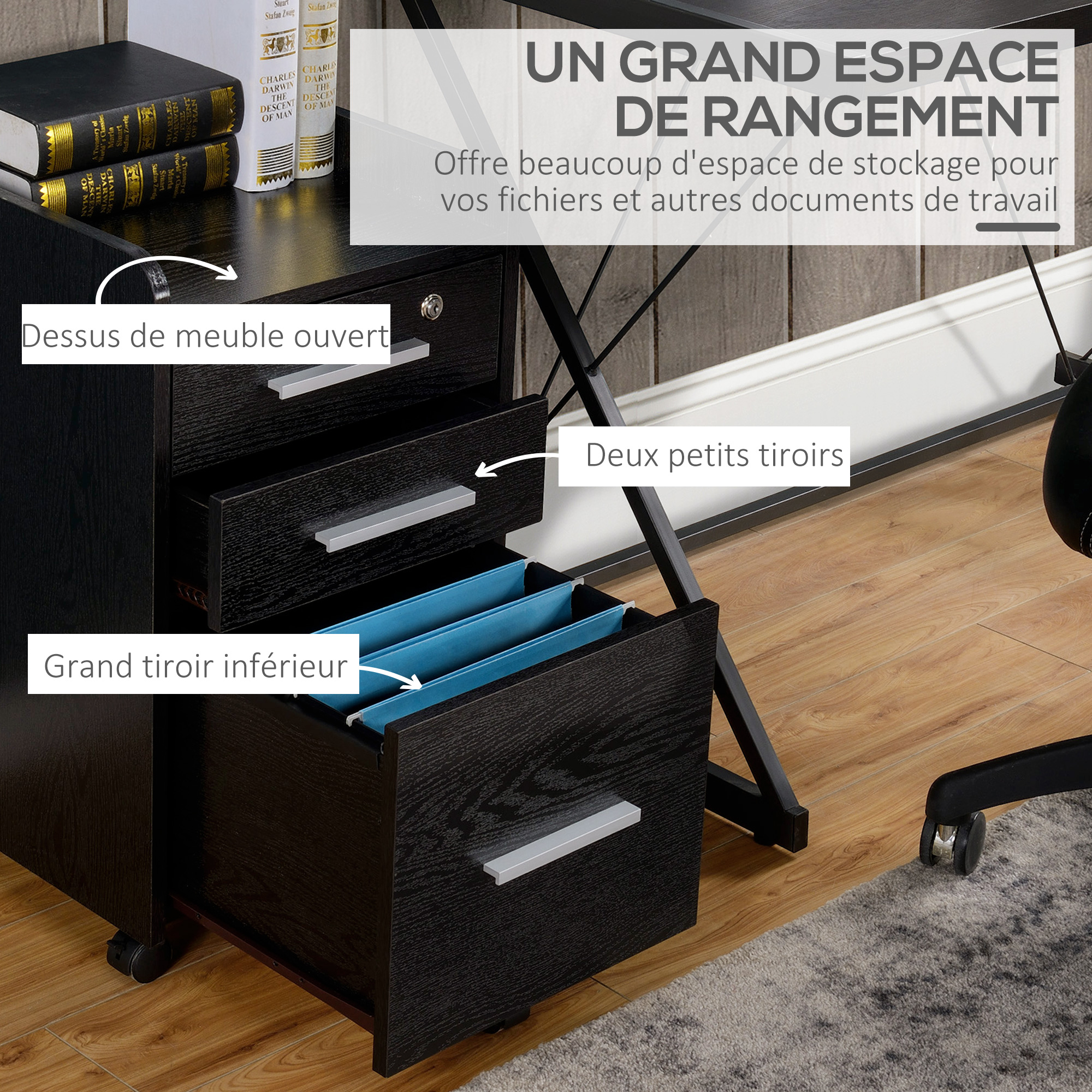 - 3 tiroirs et un plateau offrent un espace de rangement suffisant pour les fournitures de bureau