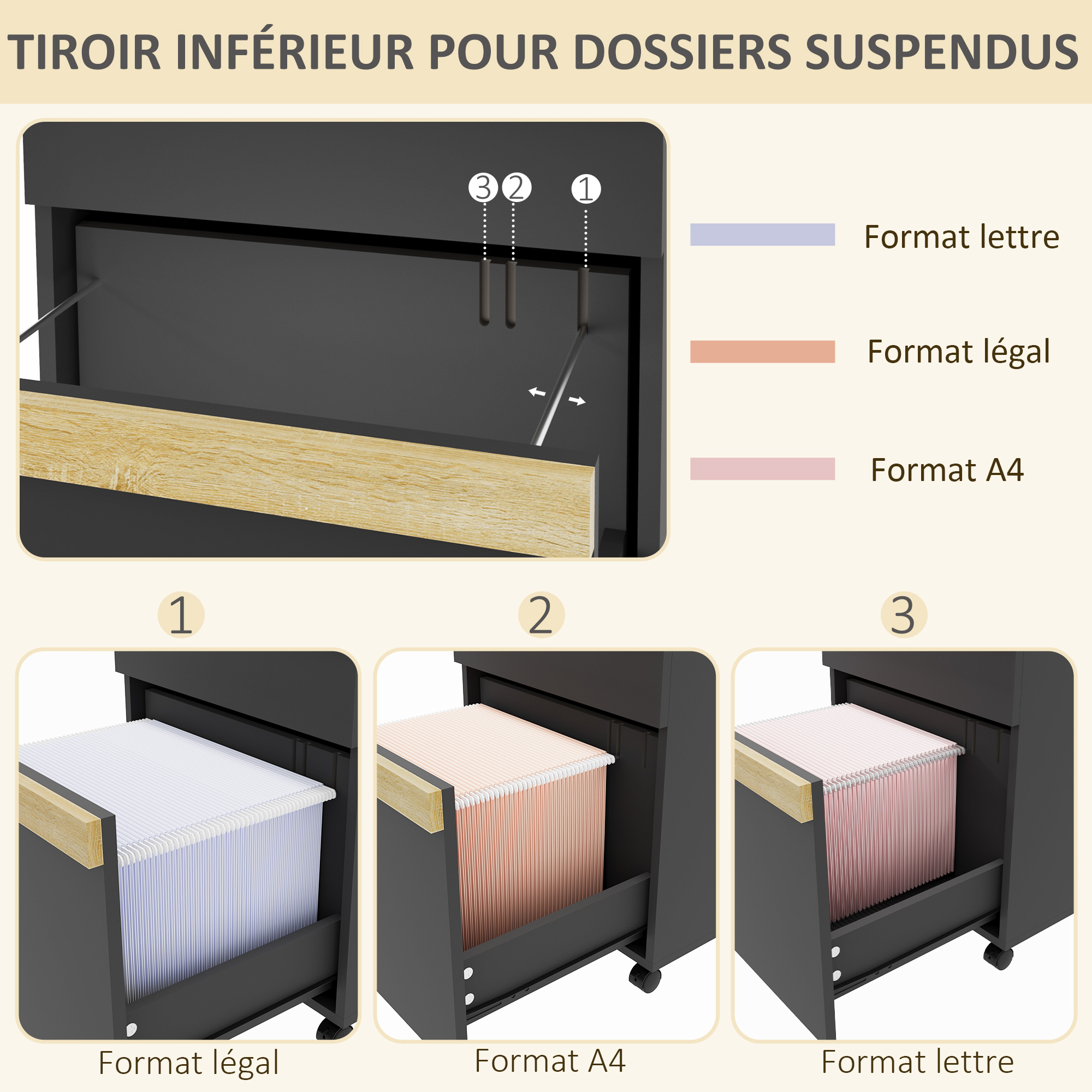 - 2 tiroirs coulissants (dont un à dossiers suspendus) vous offriront un double espace de rangement très pratique pour organiser vos documents, ranger vos fournitures de bureau, placer une imprimante, etc.