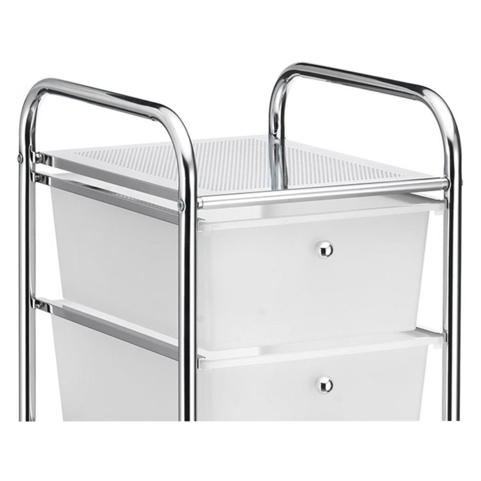 - La structure du chariot est en métal à la finition chromée et les tiroirs sont en plastique blanc transparent.