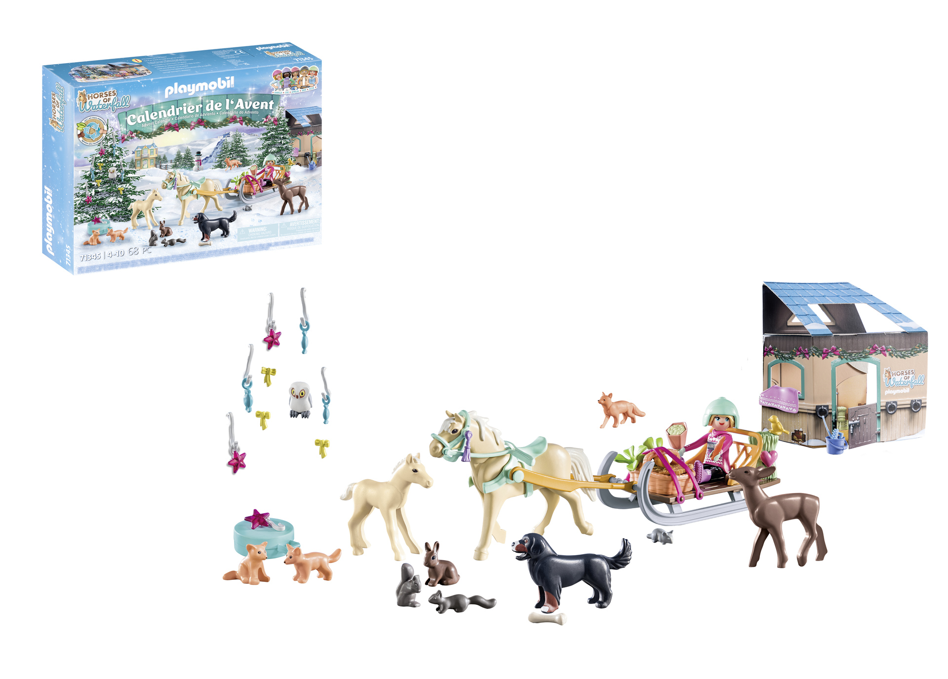 Calendrier de l'Avent avec 24 fenêtres prémontées. Contient un personnage, un cheval, un poulain, un traîneau et de nombreux animaux et accessoires.