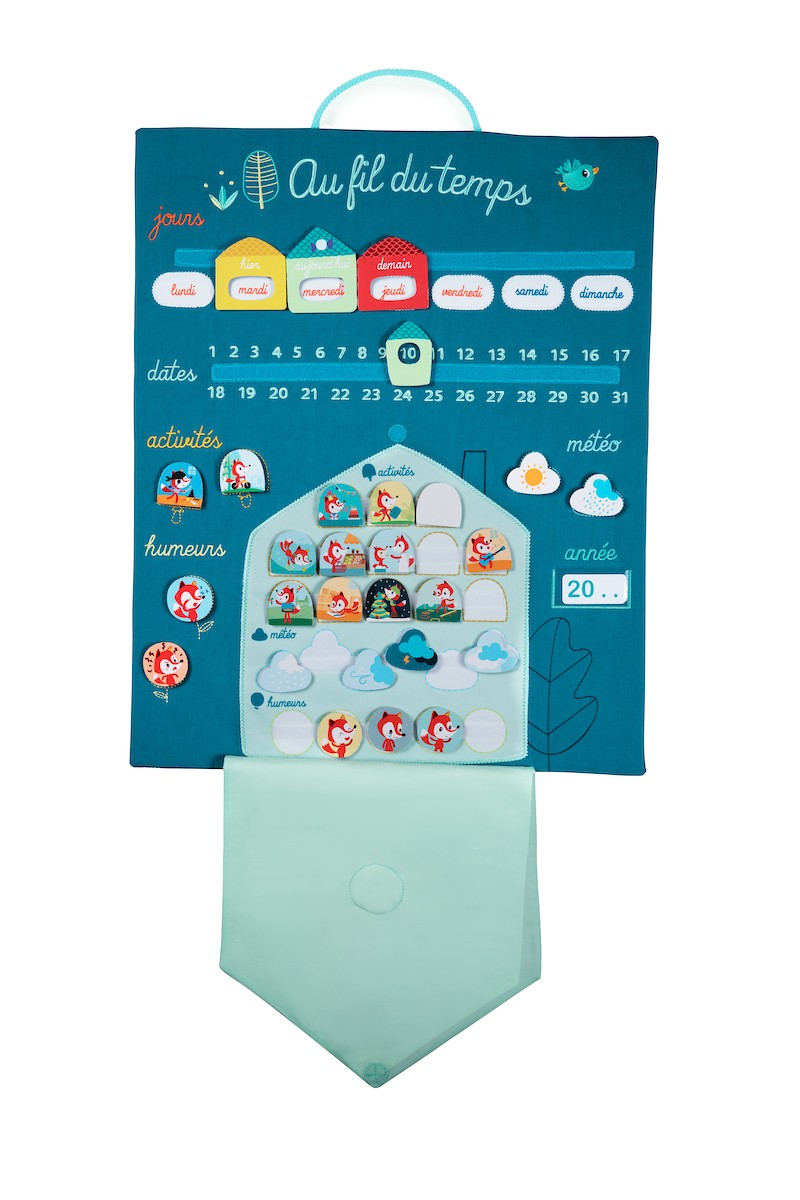 | Plus produit | Ce joli calendrier Au Fil Du Temps permettra à votre enfant de se familiariser avec les différentes notions de date, jour et année mais l'aideront aussi à comprendre ses humeurs, les saisons et la météo. Les enfants ne naissent pas avec la notion du temps : pour eux, hier c?est le passé et demain signifie maintenant ! Ce calendrier d'activités en tissu tout doux et coloré permet de mieux comprendre le concept du temps qui passe : équipé de petites cartes et de velcro, il vous permettra d?aider votre enfant à comprendre quel jour on est et quelles sont ses activités de la semaine, le tout en s?amusant. Il suffit de déposer les petits badges au bon endroit sur le calendrier et apprendre devient un jeu trop rigolo ! Il peut facilement être suspendu au mur et se transforme ainsi en une décoration de chambre ludique et originale. Dans les tons de bleu et turquoise, joliment illustré avec de délicates broderies, le tout dans un style printanier, il séduira petits et grands à coup sûr ! Peut être offert à toute occasion. Idée cadeau originale. |