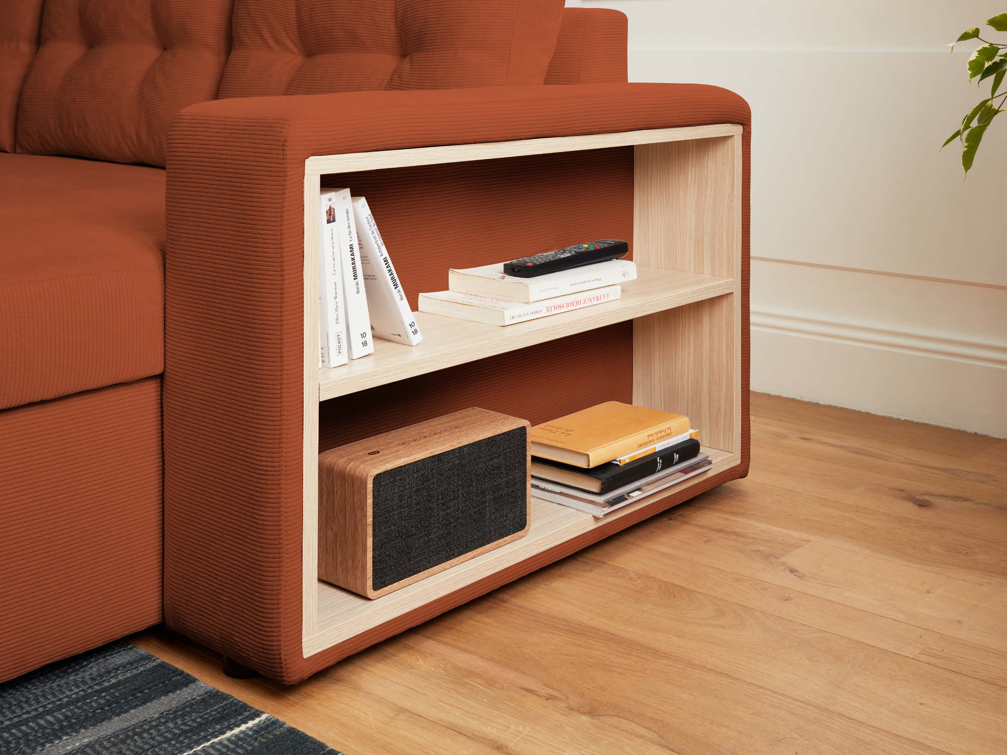 Grâce à sa fonction réversible, la méridienne de ce canapé d’angle peut se placer à gauche ou à droite et s’adapte ainsi à toutes vos envies d’aménagement. De plus, le canapé California est équipé d’un coffre de rangement situé sous sa méridienne et d'une tablette de rangement en bois intégrée dans un de ses accoudoirs. Ce canapé est également doté d’une fonction convertible vous offrant ainsi un espace de couchage occasionnel de 194x130 cm.