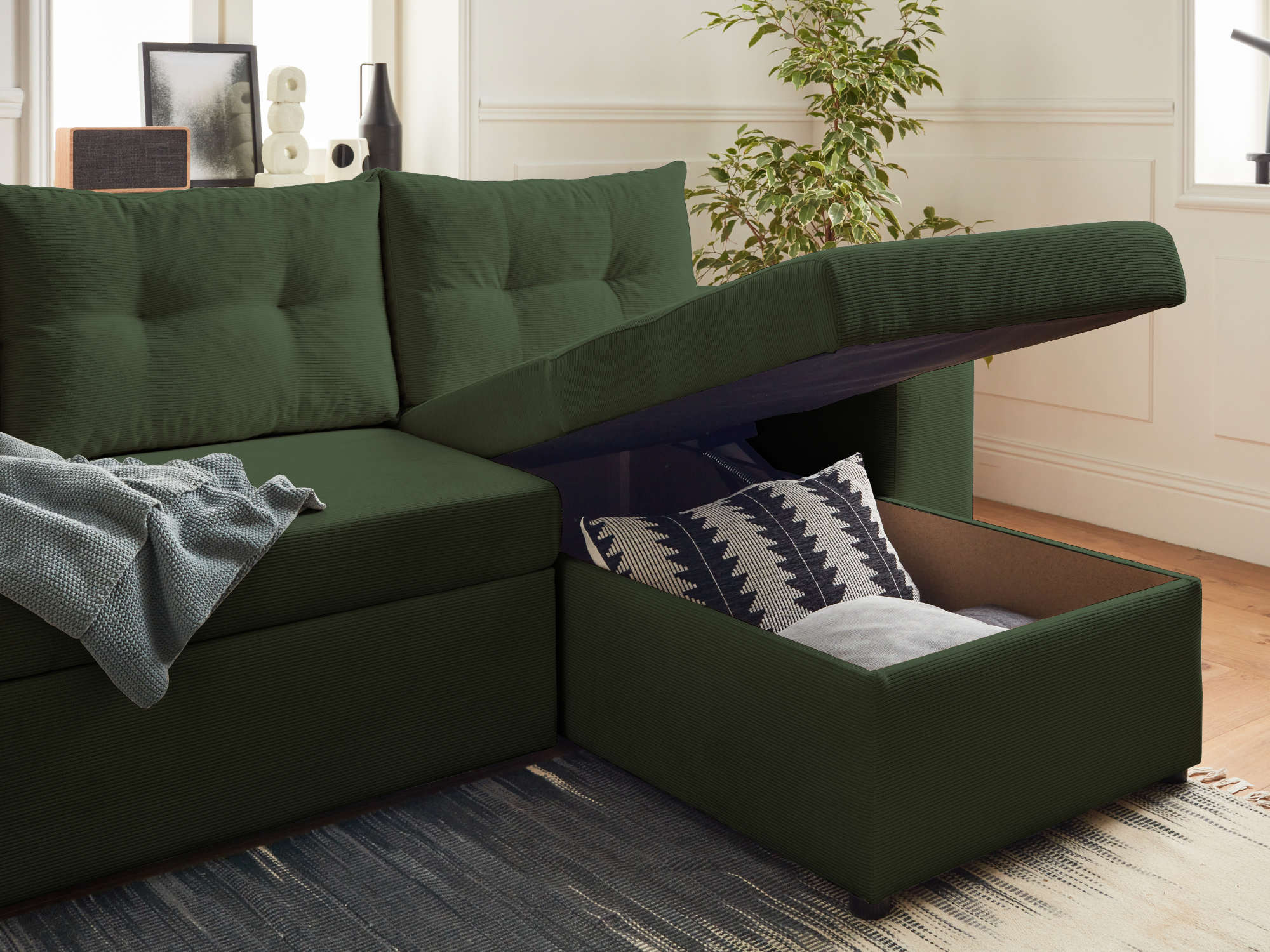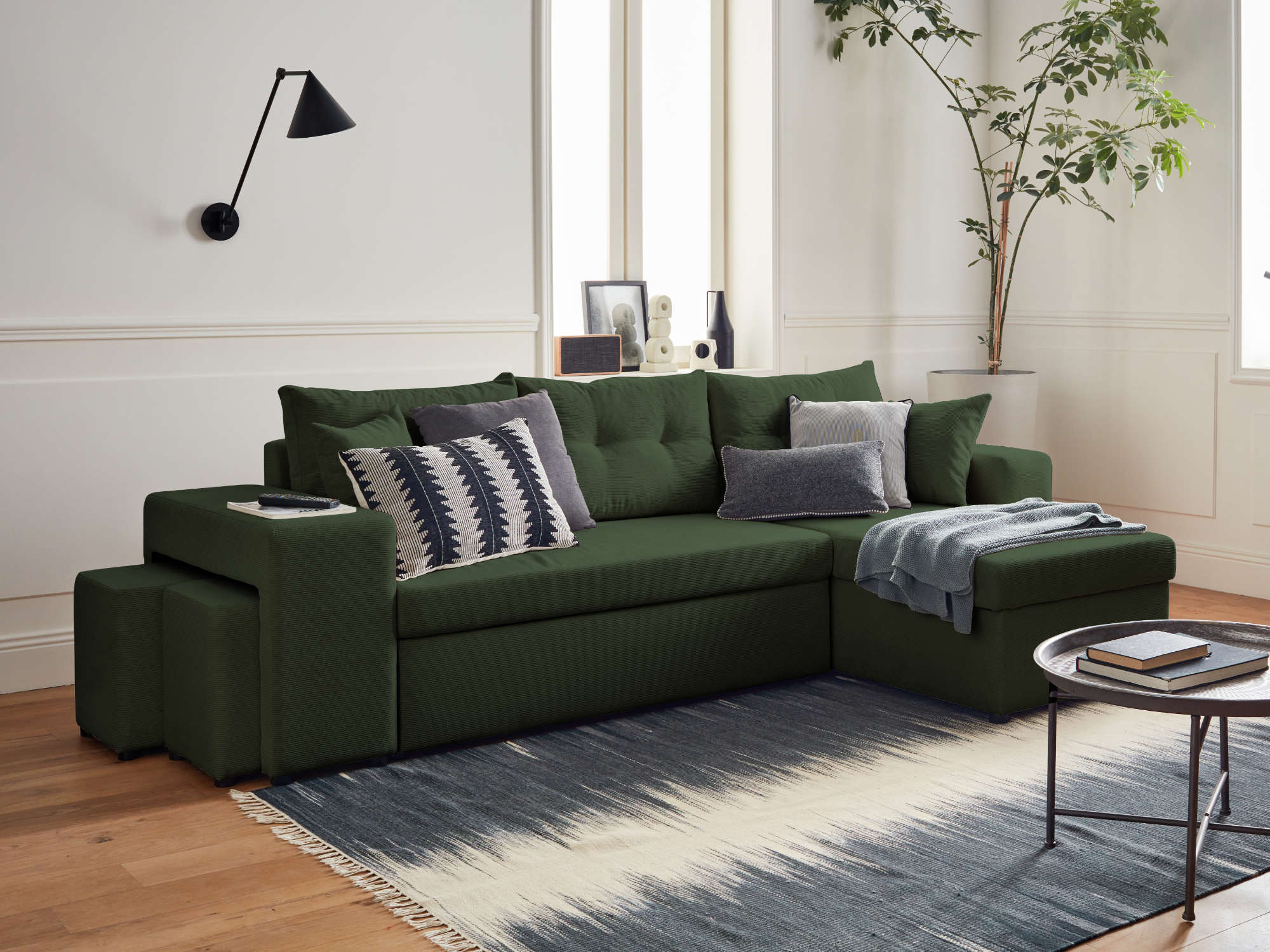 California - canapé d'angle réversible convertible - avec coffre, tablette et poufs - en velours côtelé -