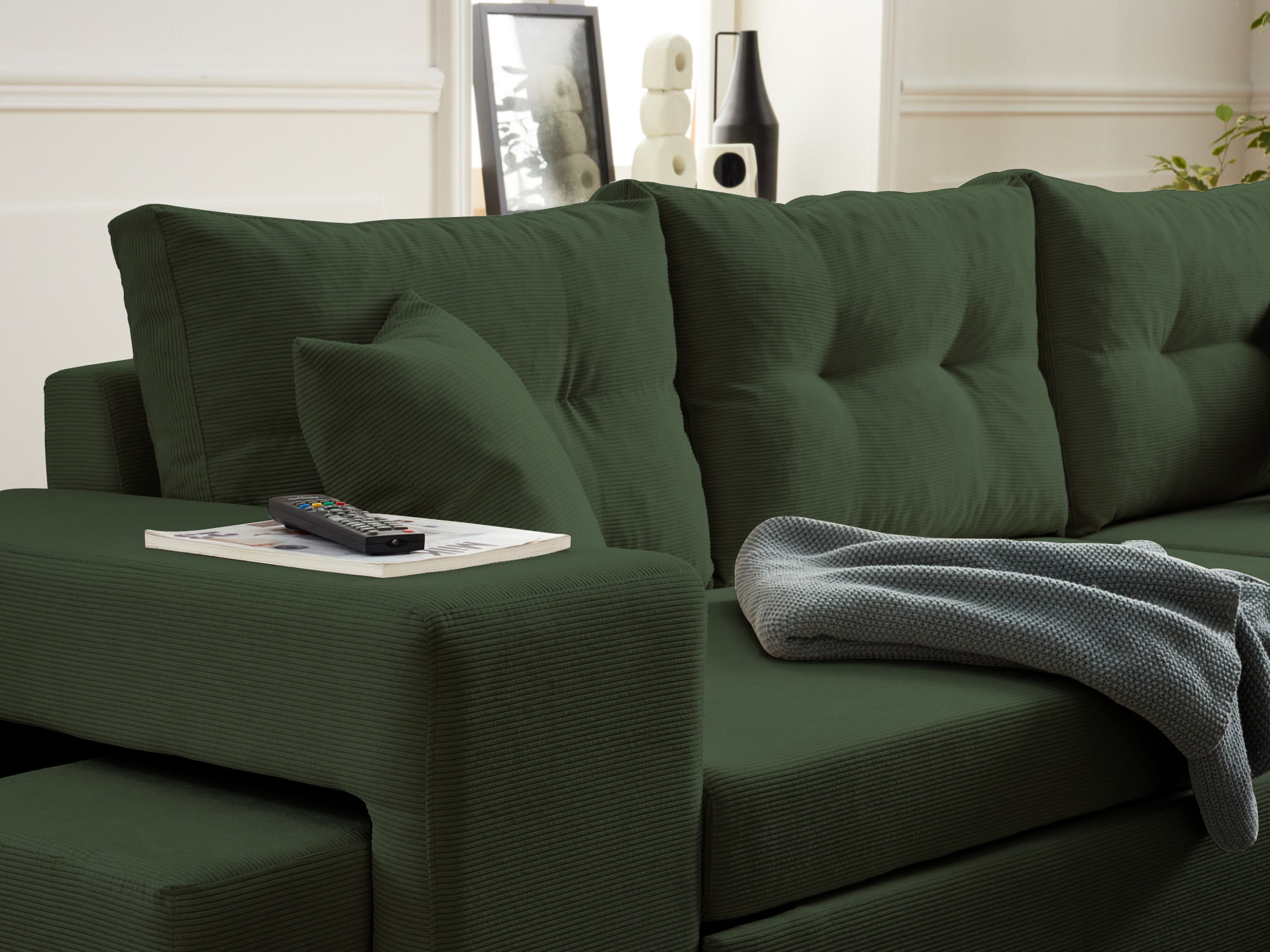 | Plus produit | [Canapé Convertible] California - canapé d'angle réversible convertible - avec coffre, tablette et poufs - en velours côtelé - 4 places combine design moderne et fonctionnalité lit intégré pour vos invités. [Couchage Quotidien] Mécanisme fluide et matelas confortable pour un usage régulier en lit 2 places. [Rangement Pratique] Coffre intégré pour stocker couette, coussins ou linge de lit facilement. [Assise Confortable] Rembourrage moelleux avec soutien ergonomique pour détente optimale. [Montage Facile] Livré en modules avec notice claire, montage rapide sans outil spécialisé. |