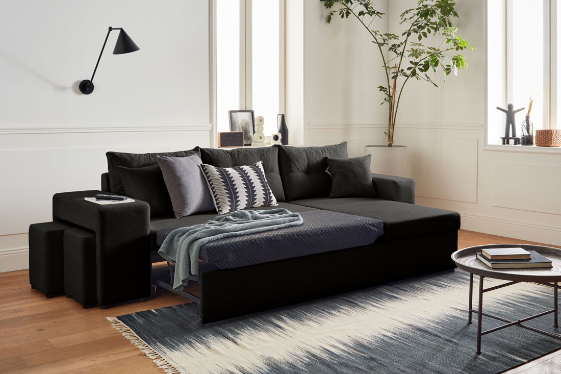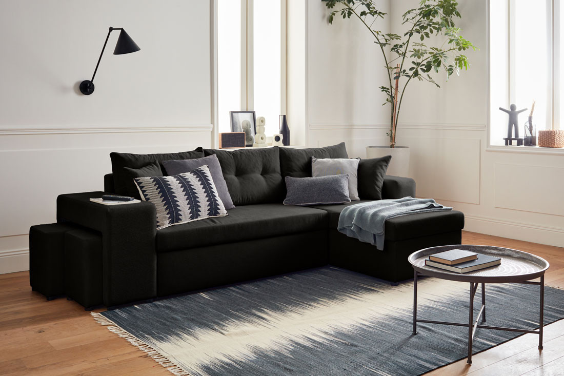 Enfin, le canapé d’angle California est également modulable grâce à ses deux poufs rangés sous l’autre accoudoir, idéal pour recevoir vos convives.