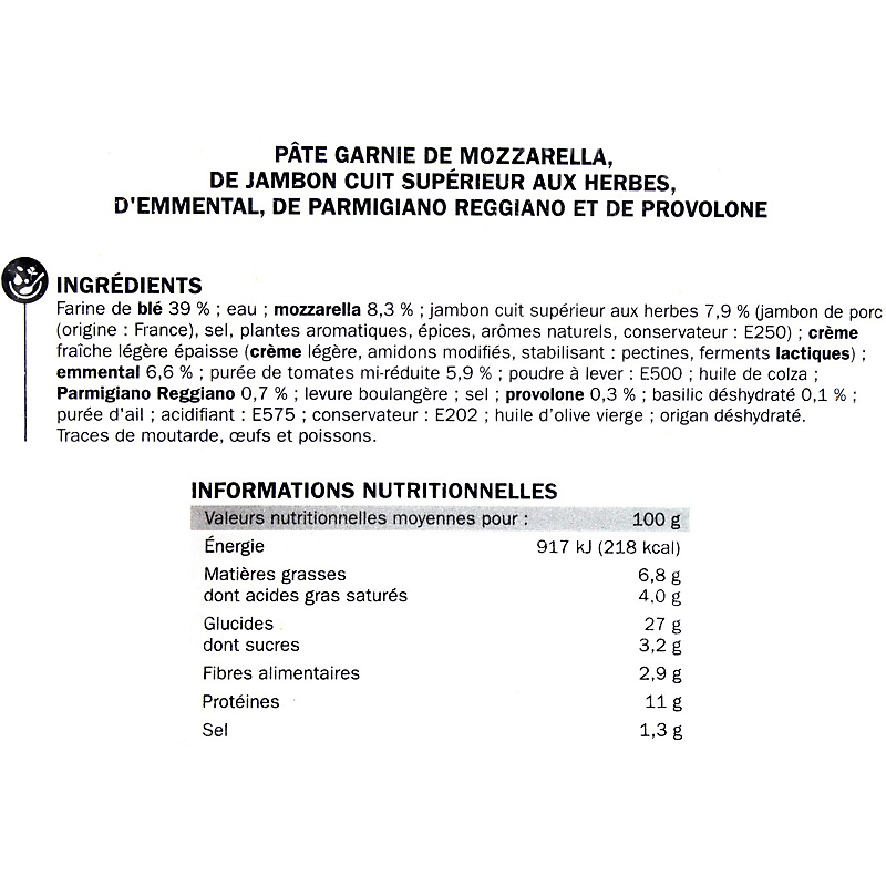 Ingrédients : Farine de blé 39 % ; eau ; mozzarella 8,3 % ; jambon cuit supérieur aux herbes 7,9 % (jambon de porc (origine : France), sel, plantes aromatiques, épices, arômes naturels, conservateur : E250) ; crème fraîche légère épaisse (crème légère, amidons modifiés, stabilisant : pectines, ferments lactiques) ; emmental 6,6 % ; purée de tomates mi-réduite 5,9 % ; poudre à lever : E500 ; huile de colza ; Parmigiano Reggiano 0,7 % ; levure boulangère ; sel ; provolone 0,3 % ; basilic déshydraté 0,1 % ; purée d'ail ; acidifiant : E575 ; conservateur : E202 ; huile d’olive vierge ; origan déshydraté.