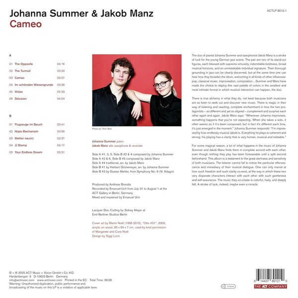 Le duo de Johanna Summer (piano) et Jakob Manz (saxophone) incarne l'excellence du jazz allemand contemporain. Alliant virtuosité, créativité et individualité, ils fusionnent jazz, classique, pop et autres influences dans une musique surprenante et envoûtante. Leur interaction intime, alliant audace et sensibilité, crée un dialogue vibrant et émotionnel. Cet album capture leur alchimie unique, colorée et pleine de magie.