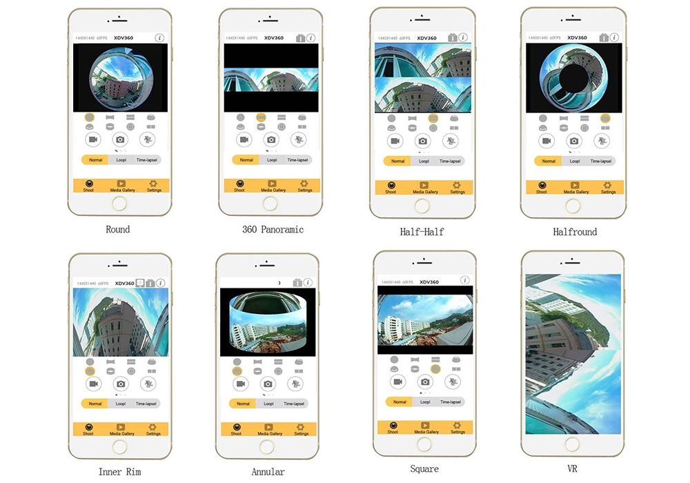 - Modes : Circulaire, panoramique 360º, demi-moitié, demi-cercle, bord intérieur, anneau, carré, VR