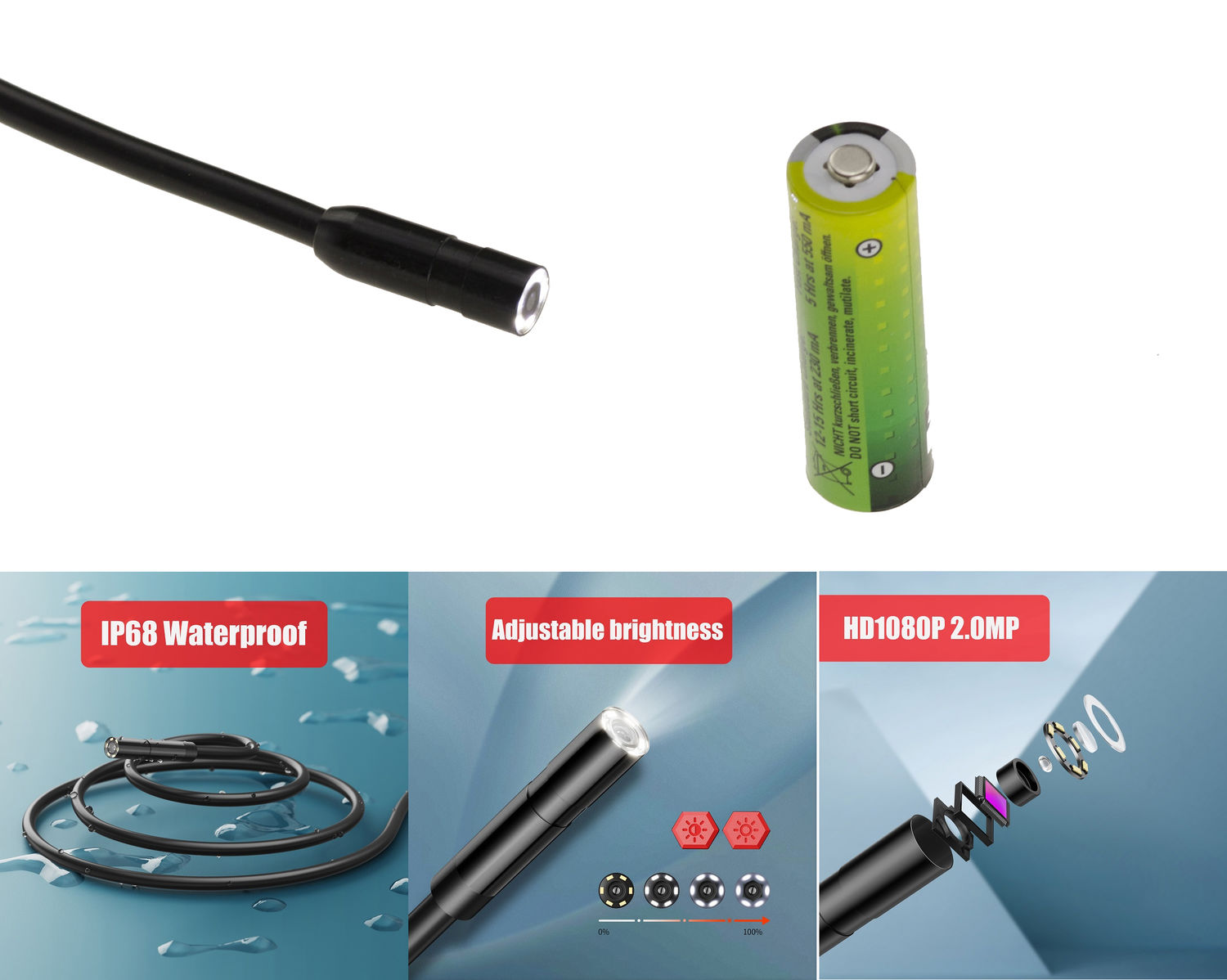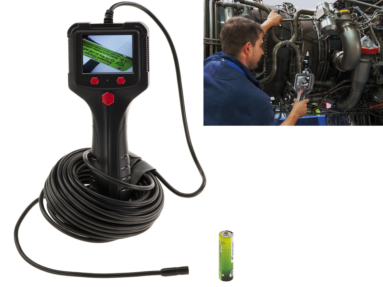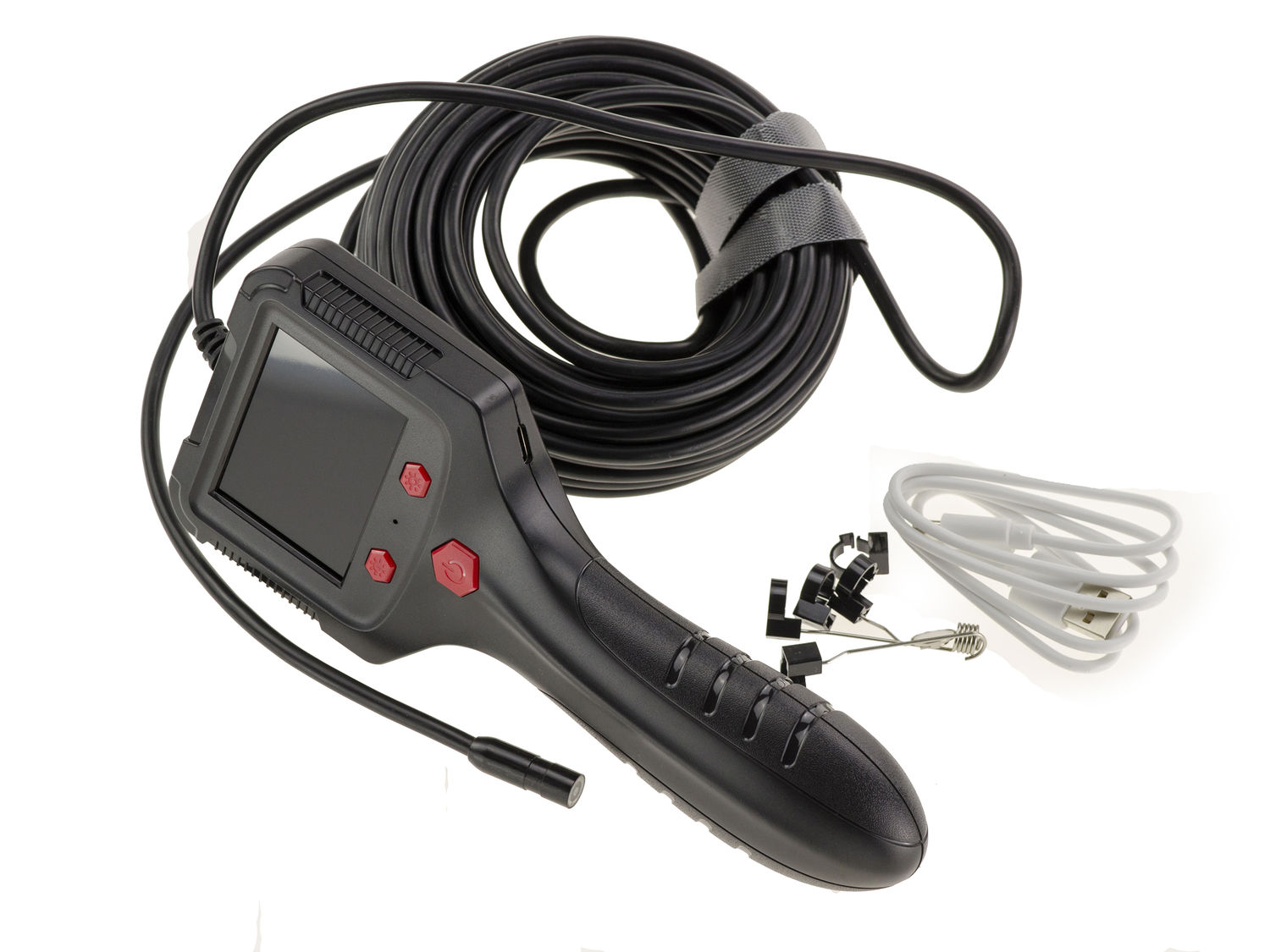 Caméra de type endoscope, avec flexible 10m et éclairage pour examiner à distance un endroit exigu. Descriptif : Diagonale d'écran 6cm, résolution : 1280 x 1080. Résolution de la caméra 1080p HD, taille de l?objectif 8 mm. Distance focale optimale 3 à 10cm. Longueur du câble : 10 m, diamètre du câble : 4,2 mm. Batterie Lithium 2600mAh, autonomie 5 heures. Rechargeable par USB (DC5V 0.8/1A). Eclairage assuré par 6 LED, intensité réglable. Fourni avec accessoires se fixant sur la caméra (crochets, miroir etc) et cordon de rechargement USB.