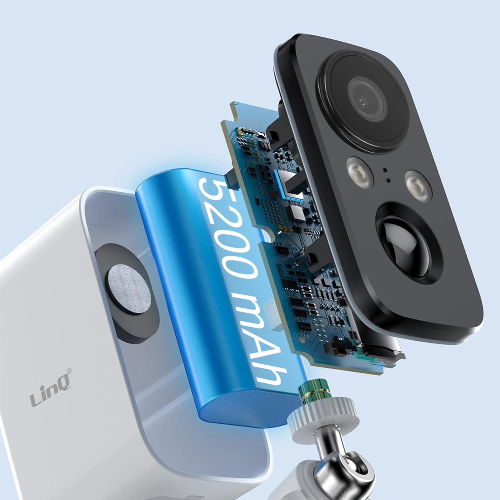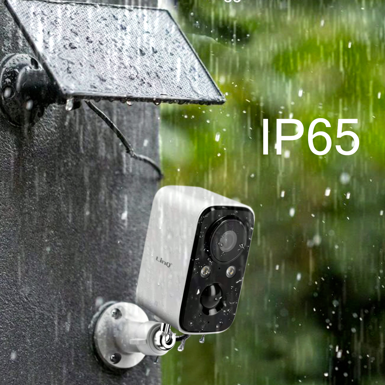 Caméra de surveillance de LinQ avec 2 batteries 5200mAh et panneau solaire 1.5W. Étanche IP65. Capteur humain avancé PIR avec alarme sonore et lumineuse. Résolution Full HD 1080p. Mode vision nocturne. Vue panoramique 360°. Fonction audio bidirectionnel.