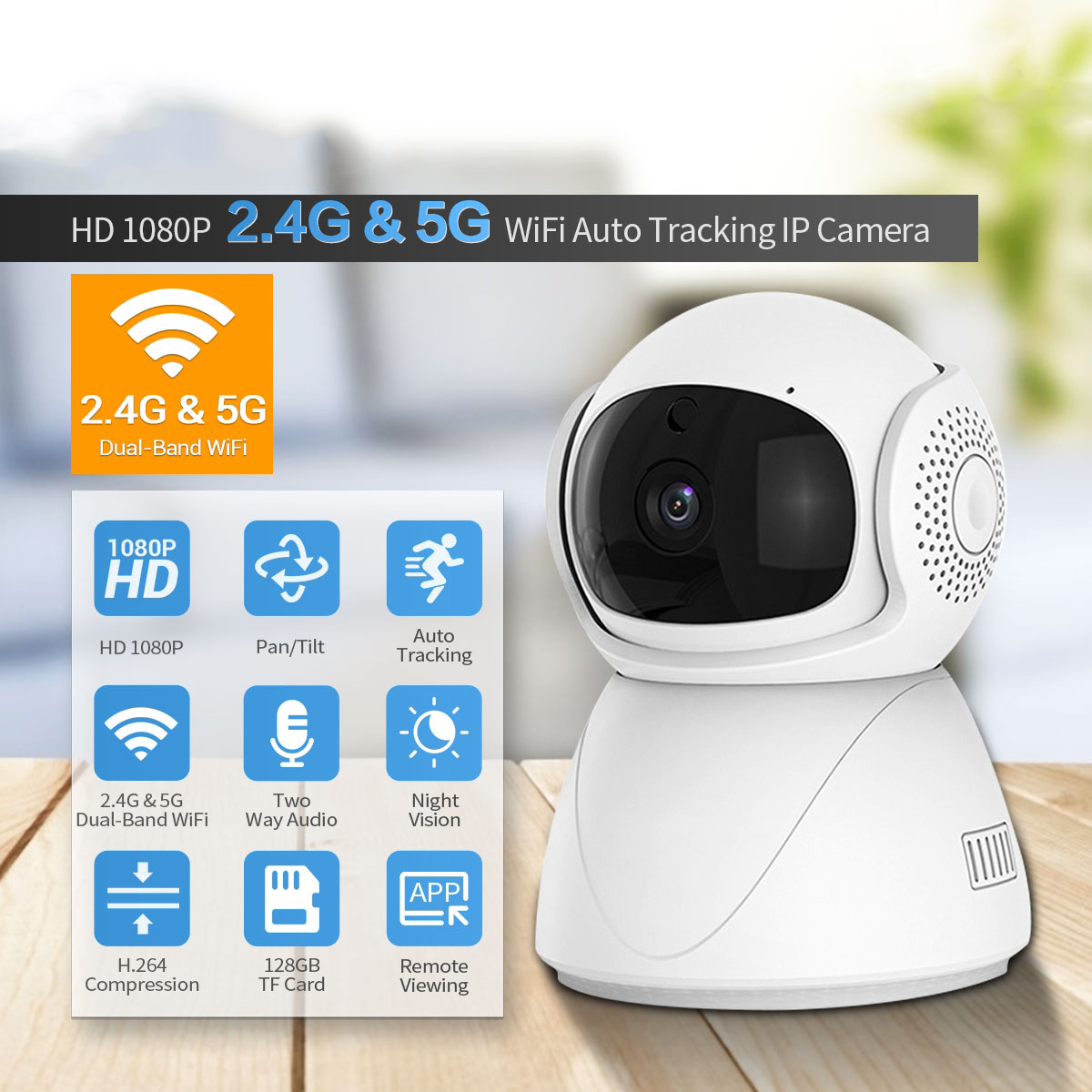 Caméra IP HD 1080P WiFi Double Bande Avec Vision Nocturne Détection Mouvement Audio Bidirectionnel + SD 8
