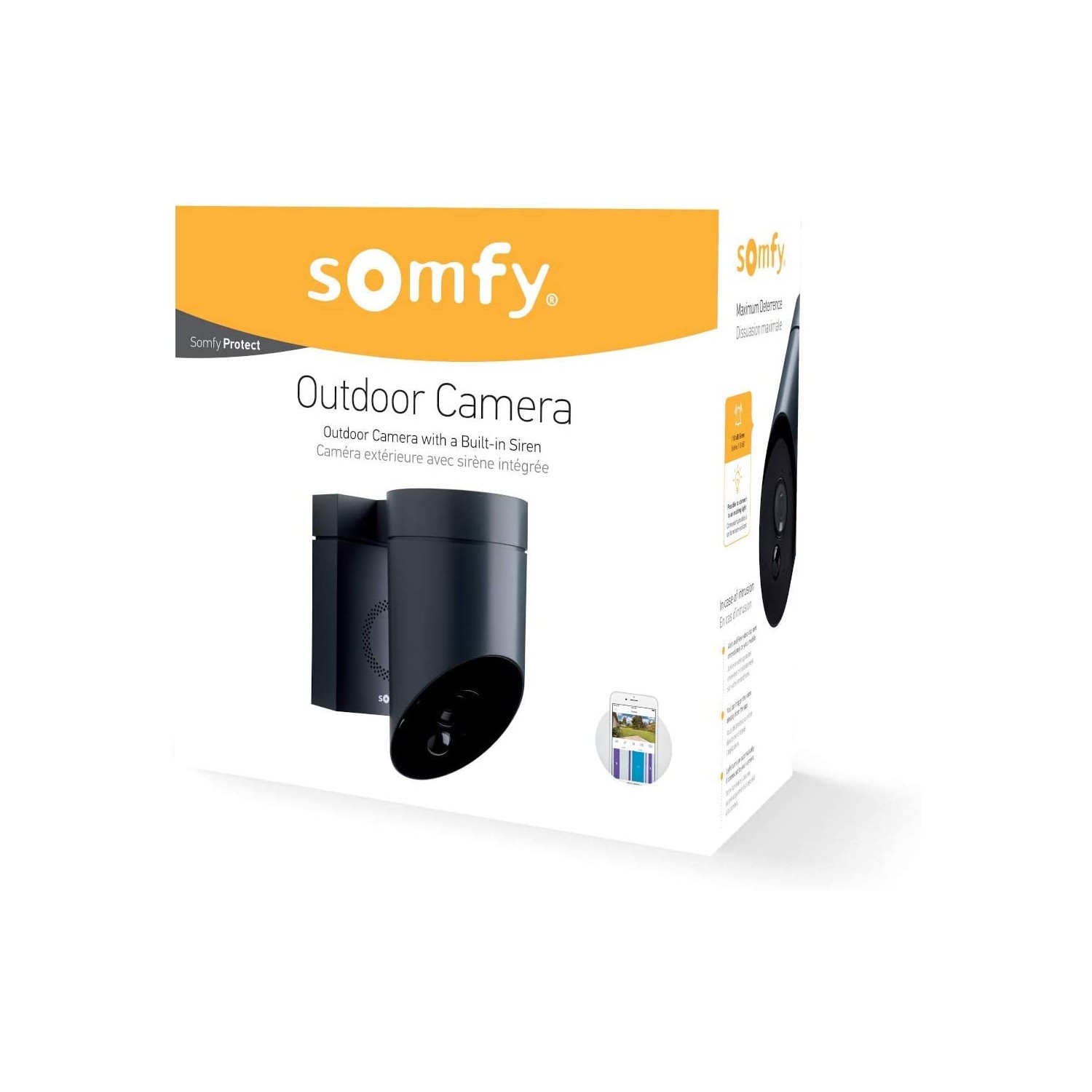 La caméra de surveillance extérieure Somfy est la plus dissuasive du marché.En cas d'intrusion, vous êtes immédiatement alerté sur votre Smartphone et une séquence vidéo de l'évènement vous est envoyée. Vous pouvez alors déclencher la sirène 110 dB depuis l'application >. Si vous avez choisi de raccorder un luminaire à votre caméra, celui-ci, s'allumera automatiquement pour renforcer la dissuasion.1. Surveillez votre extérieur et protégez votre foyerDepuis l'application >, vous pouvez, à tout moment, regarder ce qui se passe chez vous et ainsi vous assurer que tout va bien. Lorsqu'une intrusion est détectée, vous recevrez gratuitement une séquence vidéo et ainsi rien rater. S'il s'agit d'un intrus vous pourrez activer la sirène intégrée. S'il s'agit simplement d'un voisin, vous pourrez l'entendre et parler avec lui. Dans tout les cas, vous avez la possibilité de télécharger la séquence vidéo jusqu'à 24h après l'évènement.2. De hautes performances pour un produit fiable et efficaceImages Full HD 1080p avec vision nocturne à 8mGrand angle 130° et zoom x8Sirène intégrée 110dBDétection de mouvement avancée SomfyVisionTMFonction HDR (High Dynamic Range) pour pallier les problèmes de luminositéHaut parleur et microphone intégrésActivation intelligente : désactivation automatique de la protection lorsque vous rentrez à votre domicile et notification pour vous rappeler de l'activer lors de votre départDonnées sécurisées avec un chiffrement AES-256