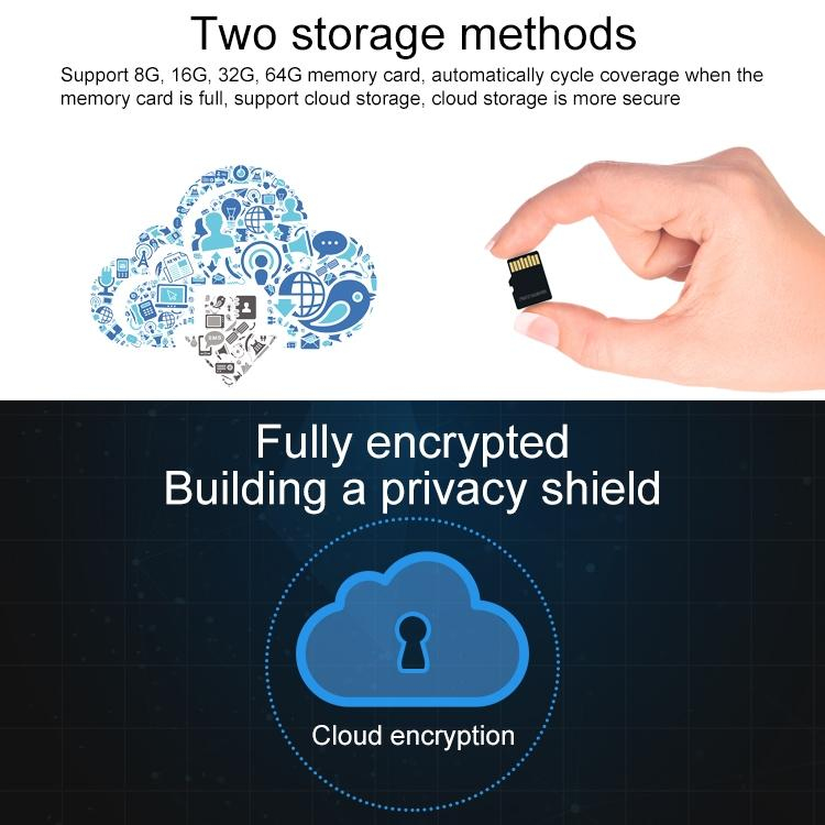 La Camera surveillance supporte deux méthodes de stockage : carte mémoire TF jusqu'à 128GB (non incluse) et stockage cloud. Vous pouvez choisir l'option qui convient le mieux à vos besoins.