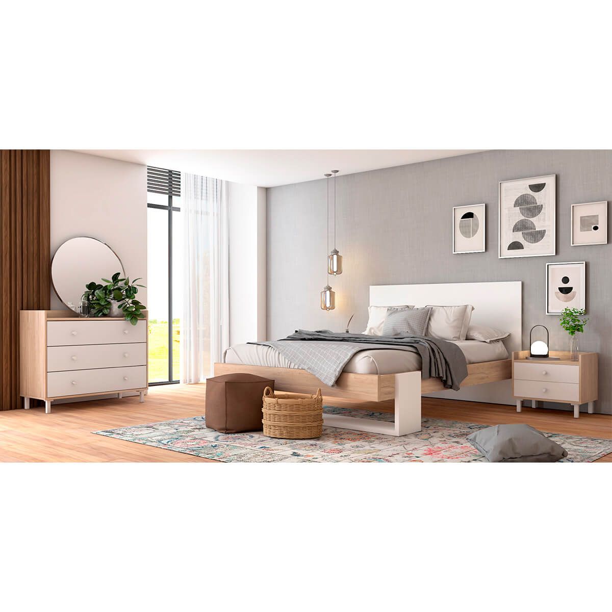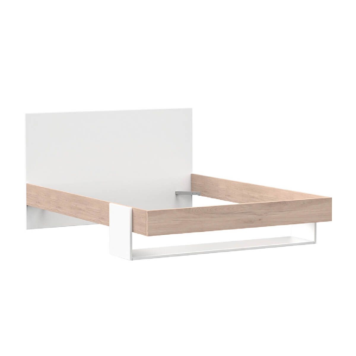 Structure en mélaminé effet chêne clair et blanc mat. Sommier et matelas non inclus.
