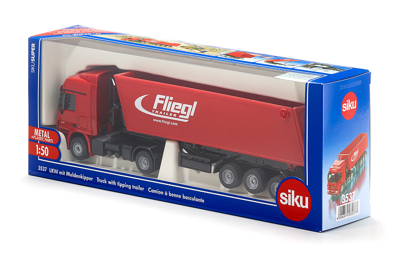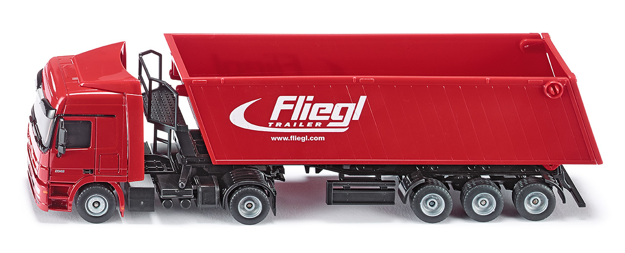La nouvelle cabine de conduite Mercedes Actros avec spoilers sous forme de tracteur à deux essieux constitue la base impressionnante du camion avec benne basculante. La semi-remorque à trois essieux avec benne de la marque Fliegl est équipée d'un châssis métallique. La benne basculante tout comme l'accès à la plateforme monté sur le châssis sont réalisés en plastique. Les béquilles mobiles et la ridelle arrière ouvrante de la benne complètent de manière impressionnante l'aspect de cet énorme semi-remorque destiné aux chantiers et au transport agricole.