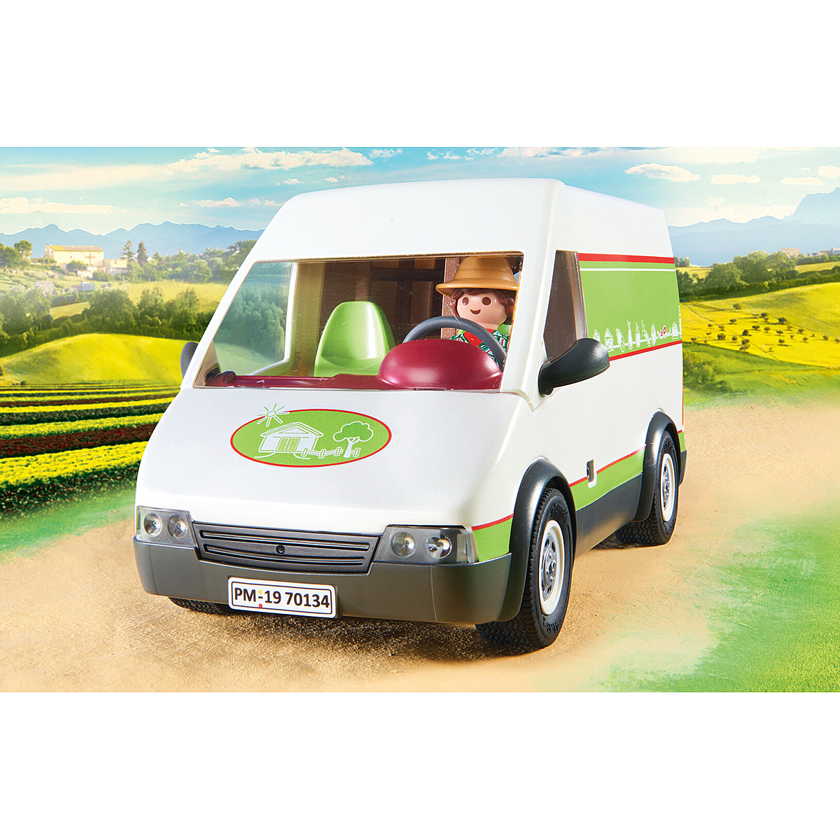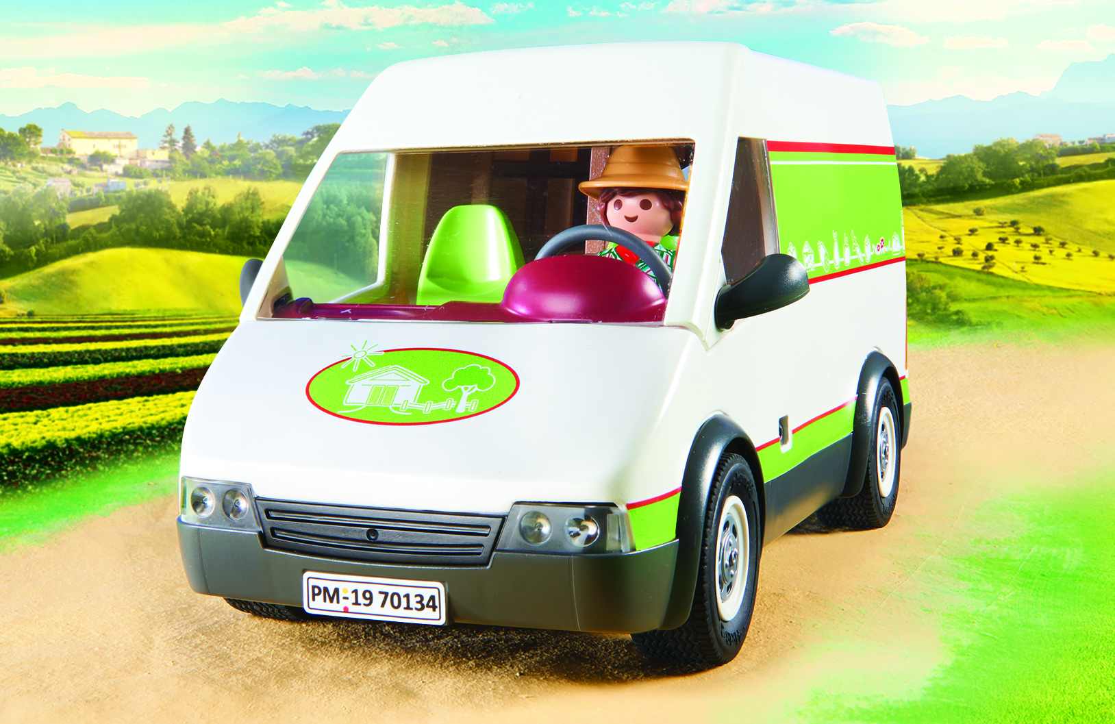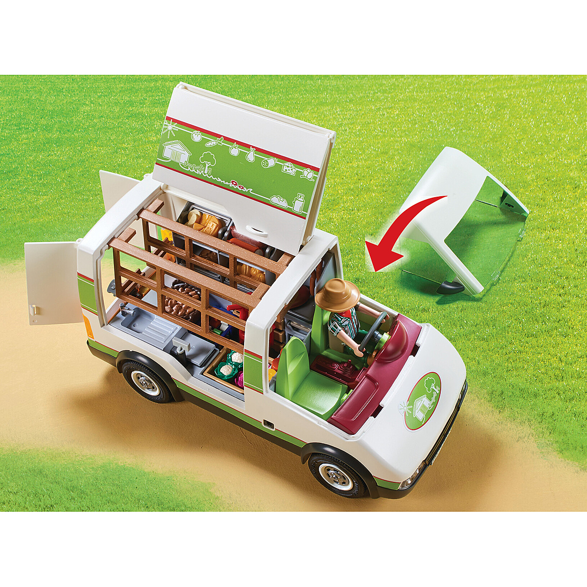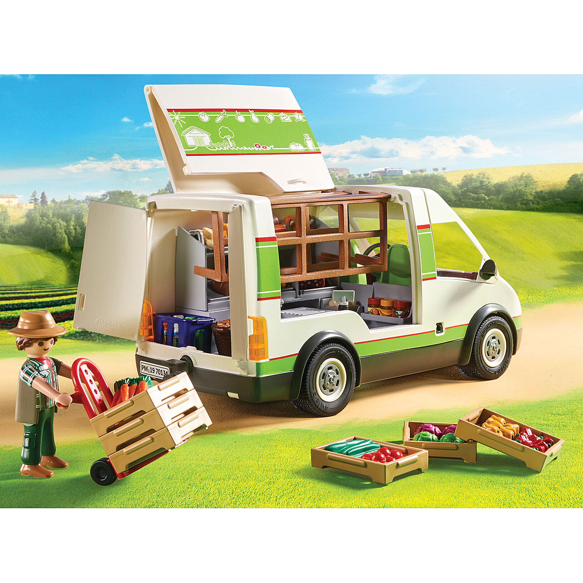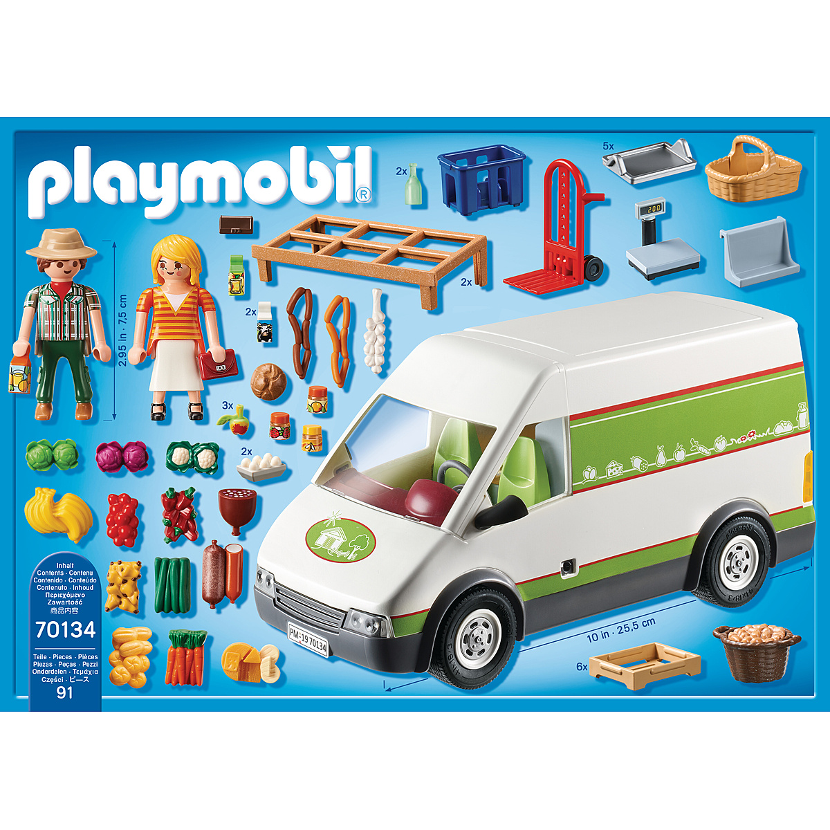 Contient 2 personnages, des étalages, des produits de la ferme (lait, ufs, saucisses, légumes) et des accessoires (panier, caisse, chapeau)