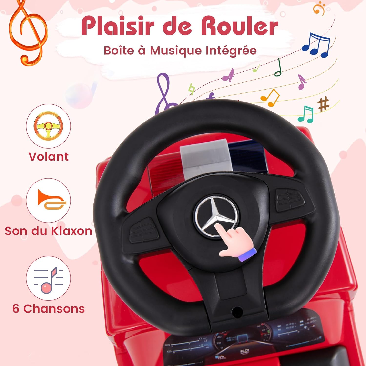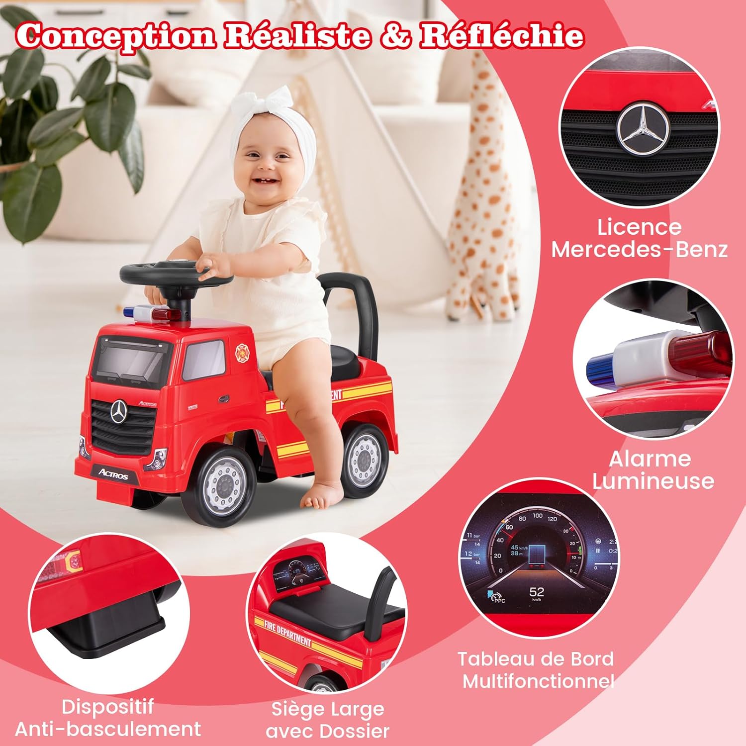 - Voiture Pousse-Pousse Mercedes-Benz : Officiellement licenciée par Mercedes-Benz, cette voiture pousse-pousse présente un look élégant et frappant. De plus, l'apparence de camion de pompier avec une lumière d'alarme vive attire l'attention des enfants, en faisant une idée merveilleux pour les enfants de 2 à 6 ans.
