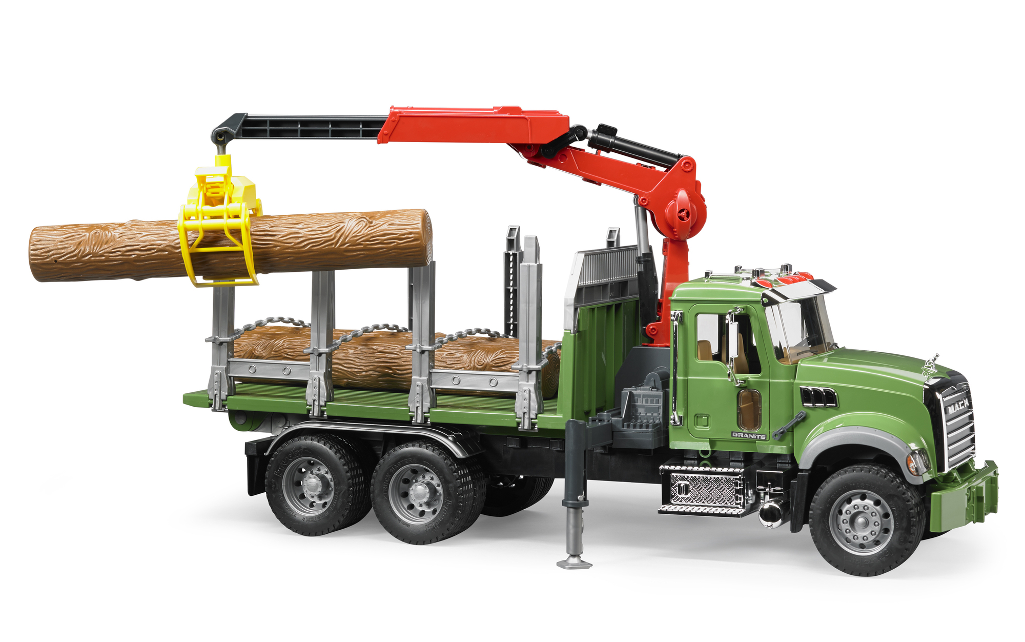 Camion Mack Granite avec grue à l'échelle 1/16 ème. Caractéristiques : Les portes de la cabine de camion à benne basculante peuvent être ouverte. Le capot peut être ouvert, le moteur est reproduit en détail. Le véhicule est équipé d'une grue de chargement en état de marche. Les ranches latéraux peuvent être rabattus. La charge se compose de 3 troncs d'arbre, d'autres troncs sont disponibles dans les accessoires (article 02348).