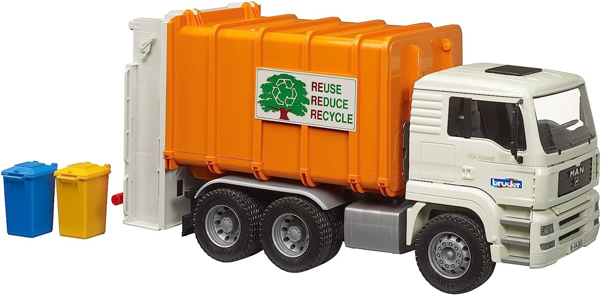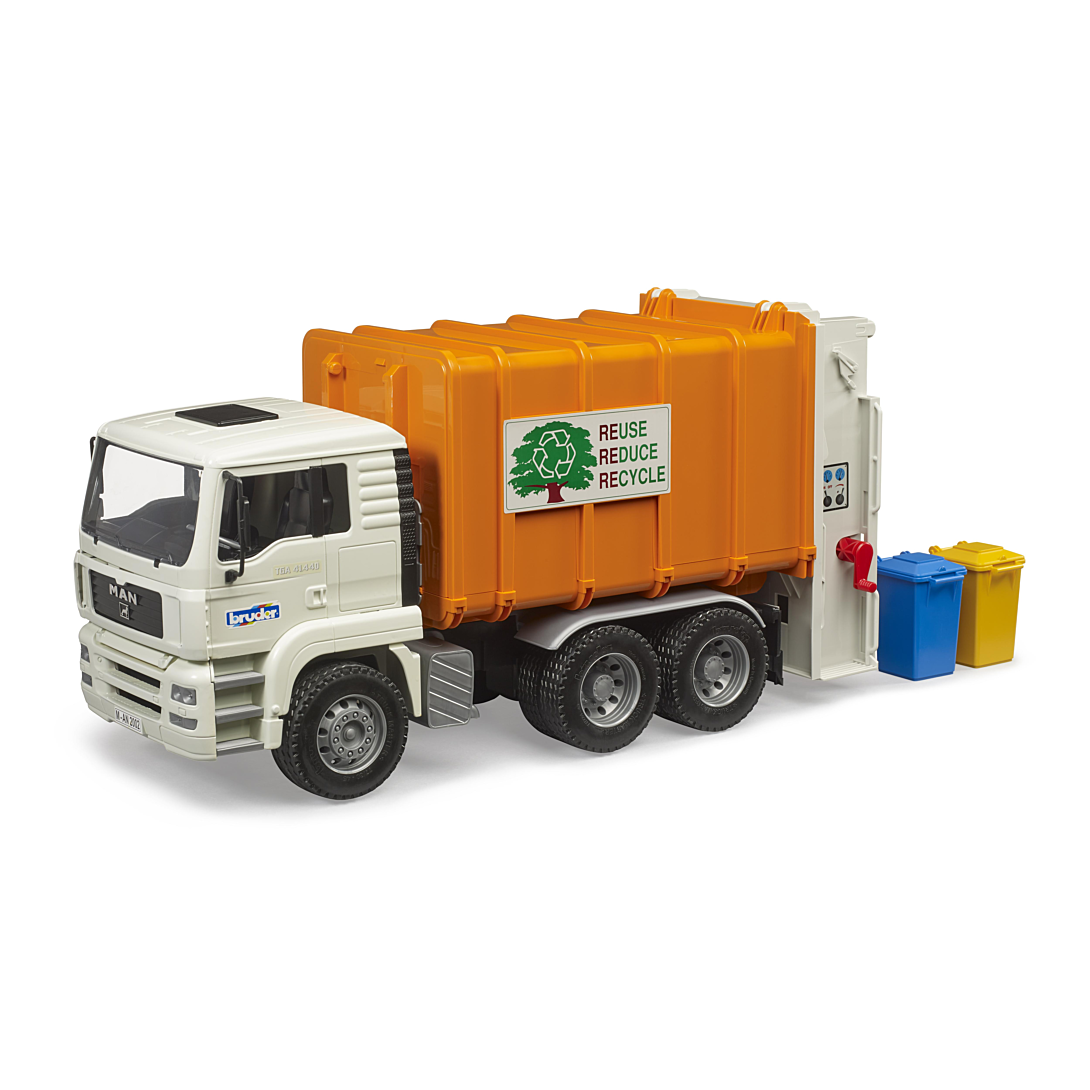 | Plus produit | Cabine\n- Cabine basculable\n- Rétroviseur ext. escamotables\n\nCarrosserie de véhicule\n- Trappe arrière s\\'ouvrant\n\nDéplacement/fonction\n- Benne à ordures basculable s\'ouvrant\n\nGénéralités\n- Age recommandé : à partir de 3 ans pour l\'intérieur et l\'extérieur\n- Fabriqué en plastiques de qualité, par ex. ABS\n- Made by Bruder\n- Echelle 1:16 |