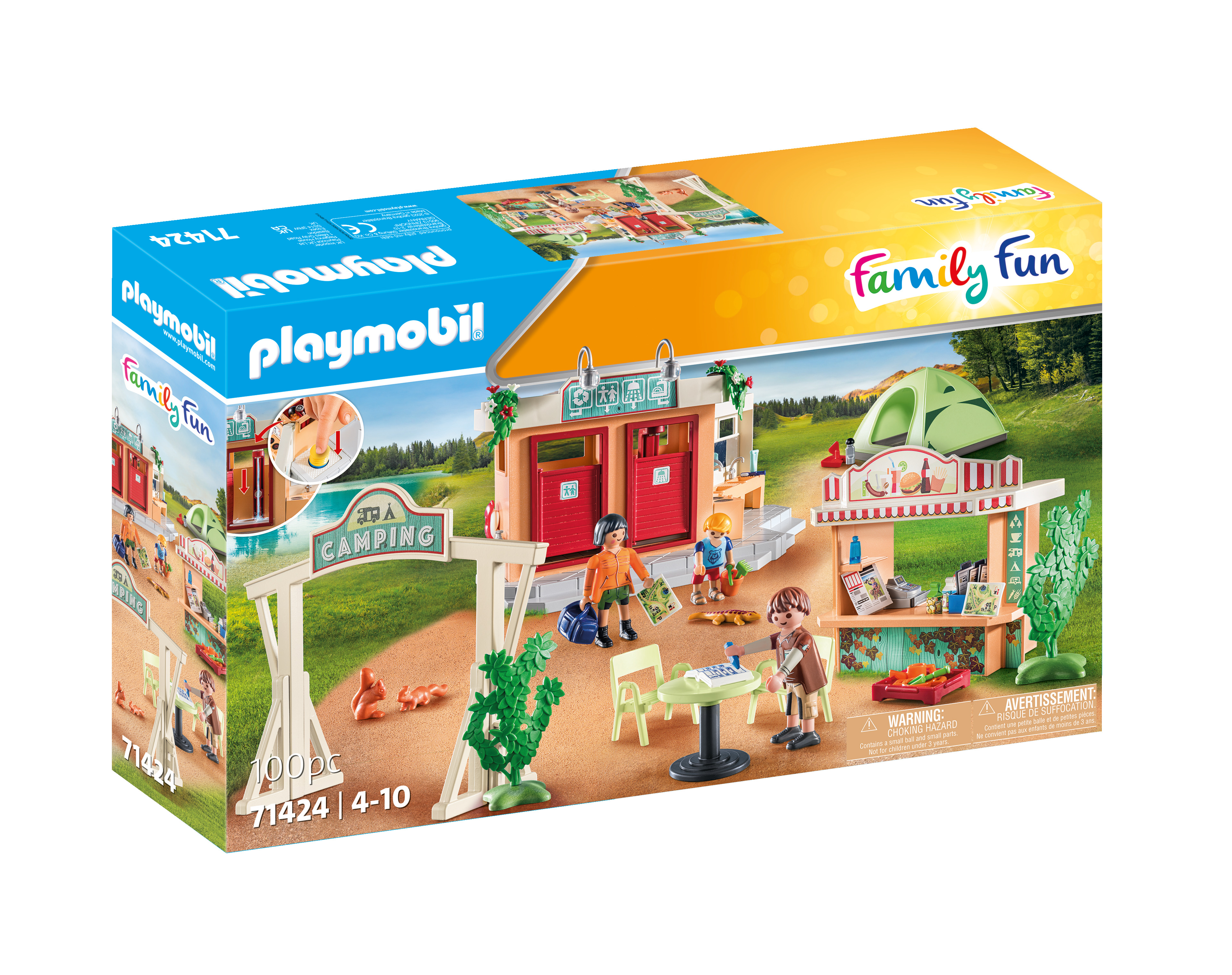 Le gérant du camping est là pour accueillir les vacanciers. Bienvenue au camping ! Vous avez réservé ? Il y a plein d’activités à découvrir au camping PLAYMOBIL. Le bâtiment des sanitaires permet de prendre sa douche et de faire à manger. L’eau de la douche coule vraiment grâce à une pompe située à l’extérieur. Au kiosque, il est possible de récupérer de délicieux snacks. Ce coffret est composé de trois personnages PLAYMOBIL, un bâtiment pour les sanitaires, un kiosque, une tente, une table, des chaises et de nombreux autres accessoires.