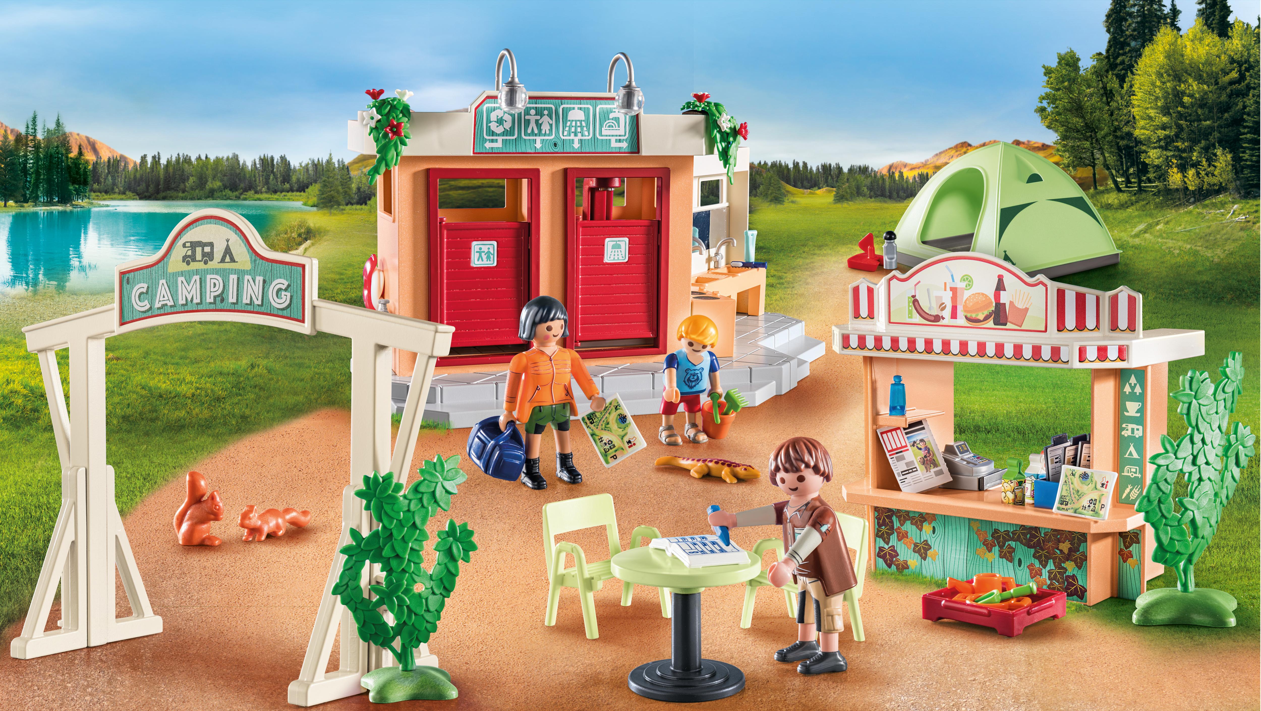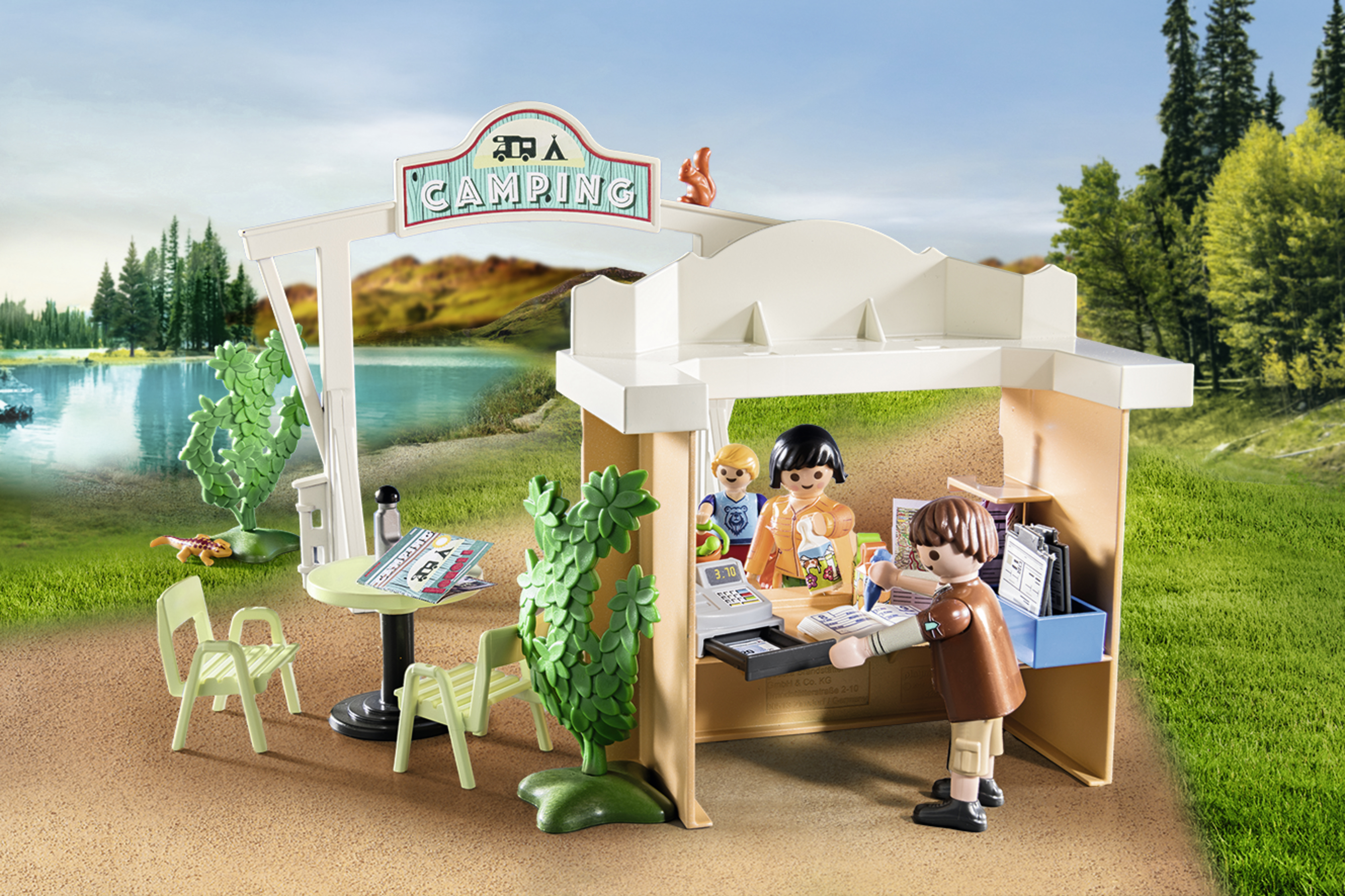 Le gérant du camping est là pour accueillir les vacanciers. Bienvenue au camping ! Vous avez réservé ? Il y a plein d’activités à découvrir au camping PLAYMOBIL. Le bâtiment des sanitaires permet de prendre sa douche et de faire à manger. L’eau de la douche coule vraiment grâce à une pompe située à l’extérieur. Au kiosque, il est possible de récupérer de délicieux snacks. Ce coffret est composé de trois personnages PLAYMOBIL, un bâtiment pour les sanitaires, un kiosque, une tente, une table, des chaises et de nombreux autres accessoires.