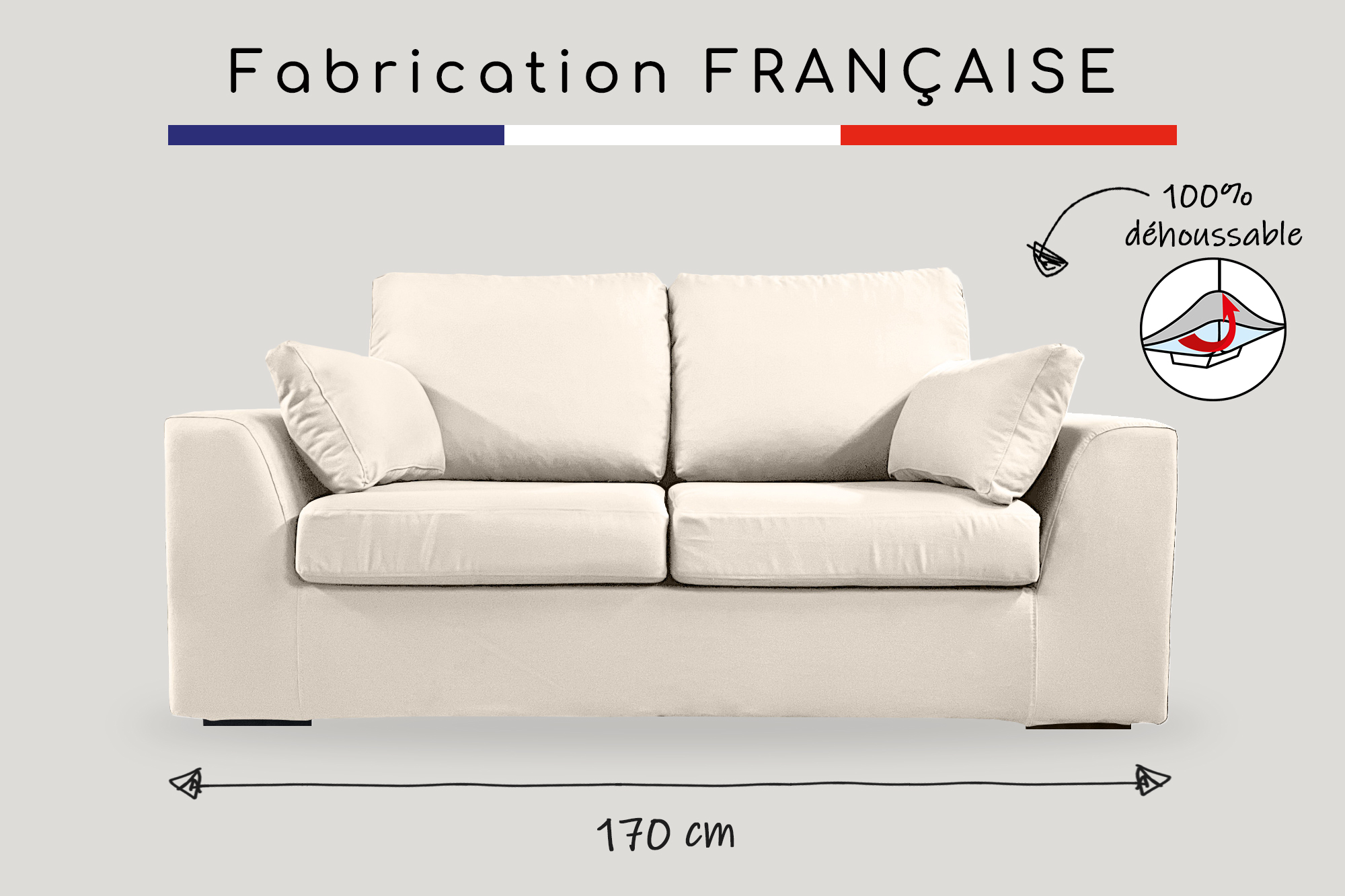 Canapé 2 pl TRESSIN 170 cm fixe tissu coton Écru - 100% déhoussable - Fab. France