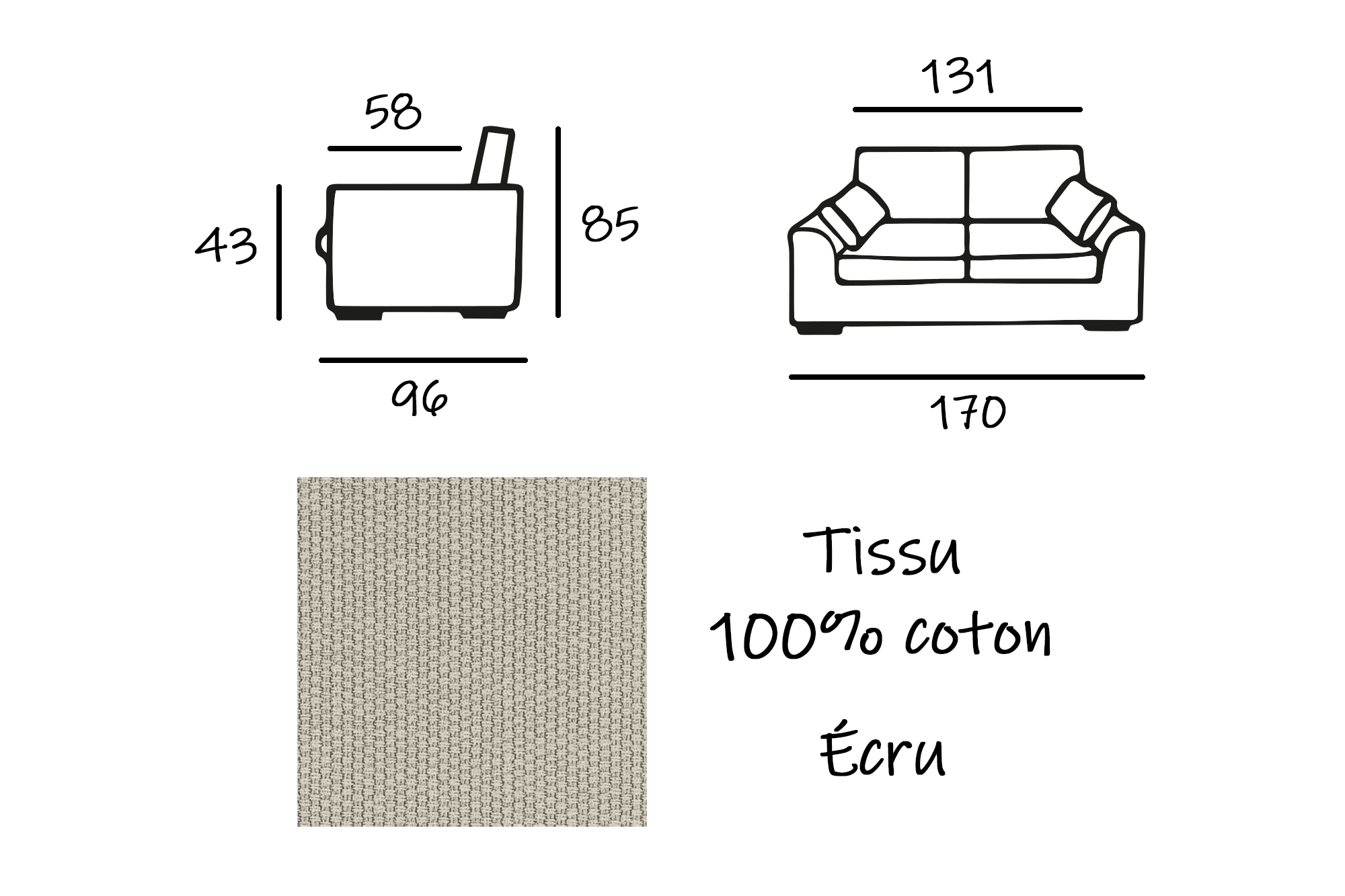 | Libellé | Canapé 2 pl TRESSIN 170 cm fixe tissu coton Écru - 100% déhoussable - Fab. France |