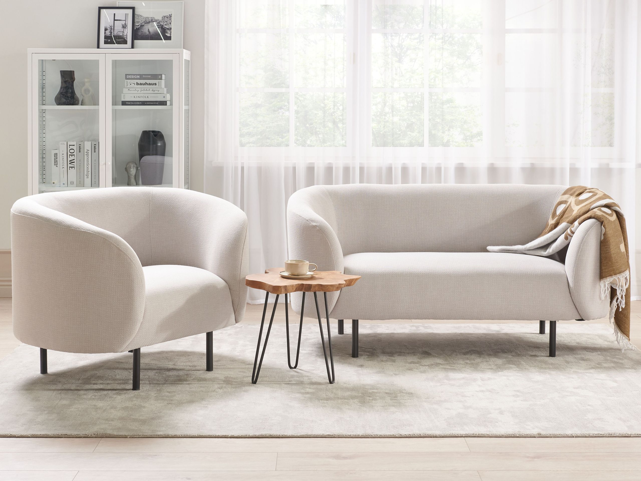 Causeuse boucle. Ce canapé glamour dégage une impression de luxe, avec ses pieds noirs et les courbes douces de sa silhouette tapissée. Son tissu beige molletonné lui apporte douceur et confort. Le siège rembourré épais offre une assise confortable, ce qui en fait l'endroit idéal pour lire ou regarder la télévision tard le soir. Le design opulent du canapé s'accordera parfaitement aux intérieurs de style éclectique, traditionnel ou années 50.