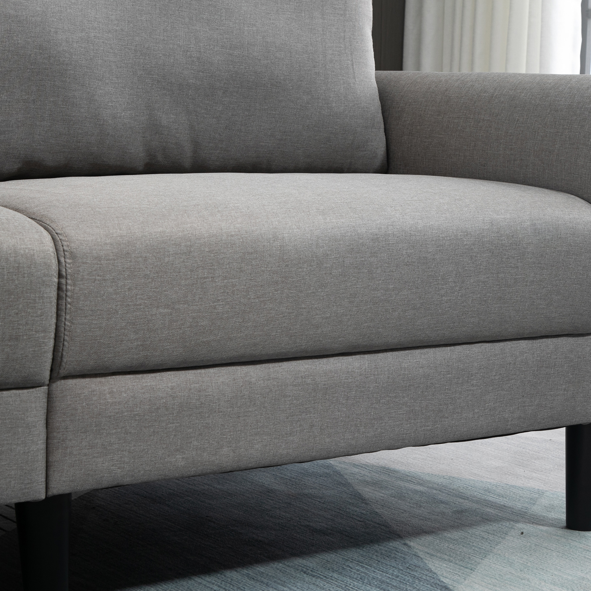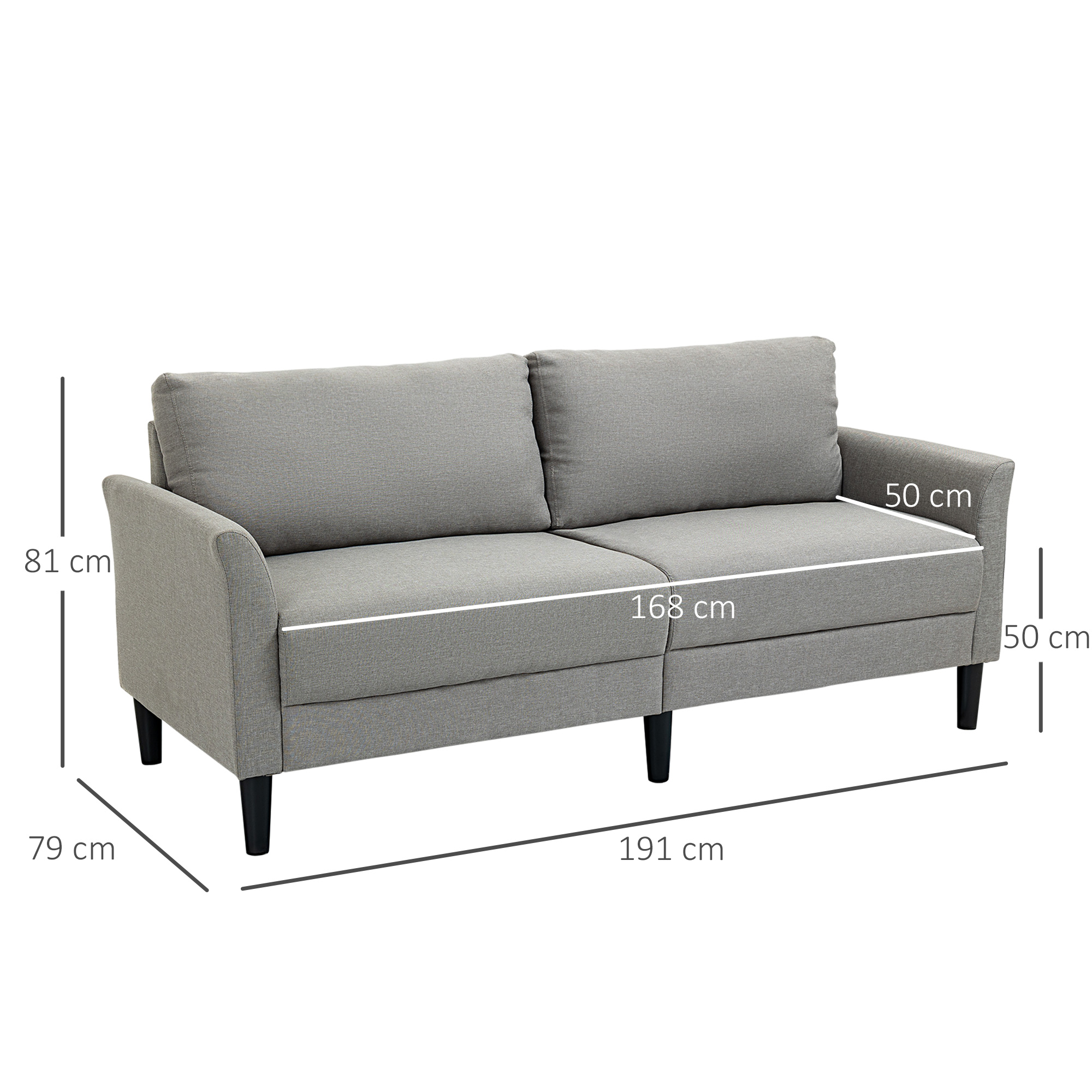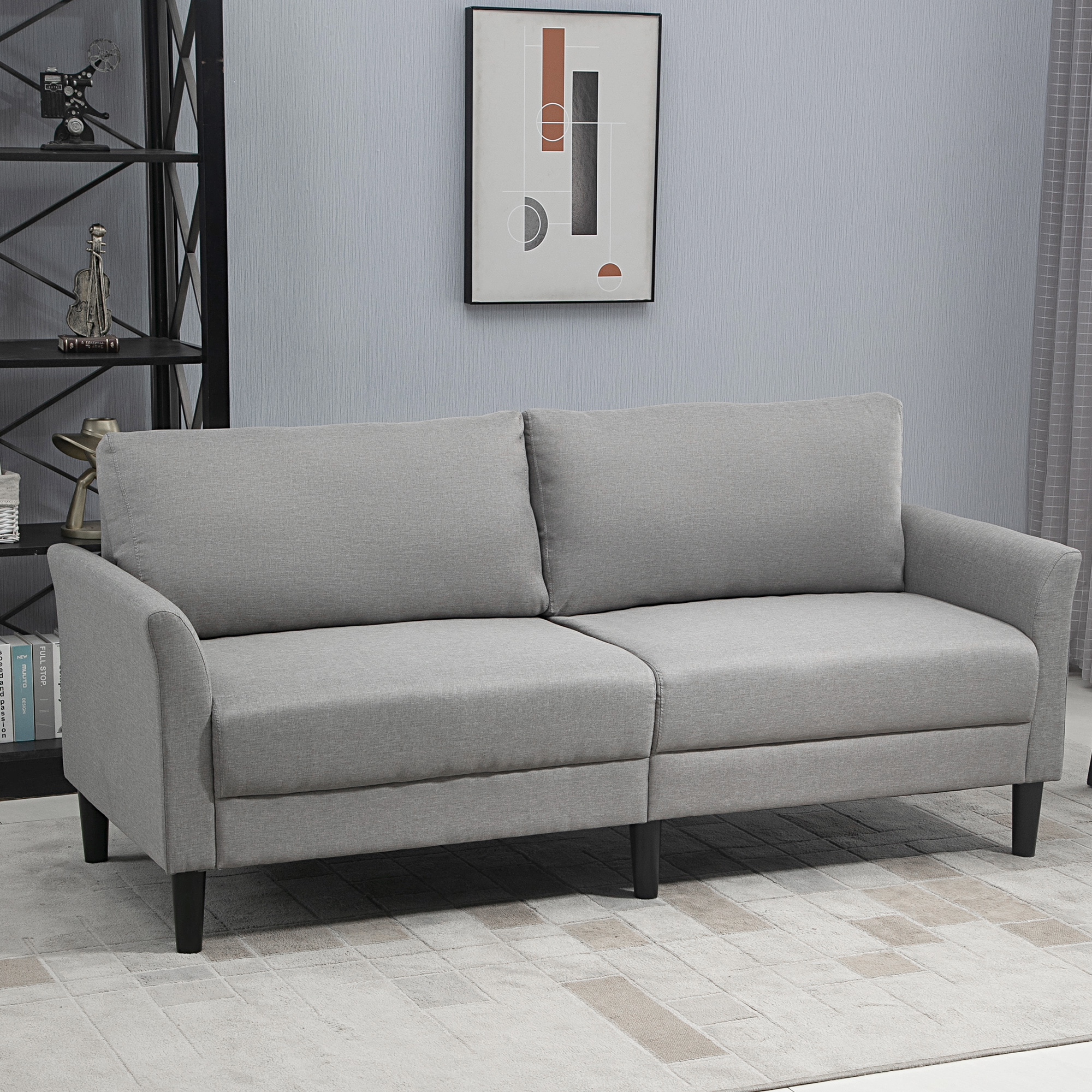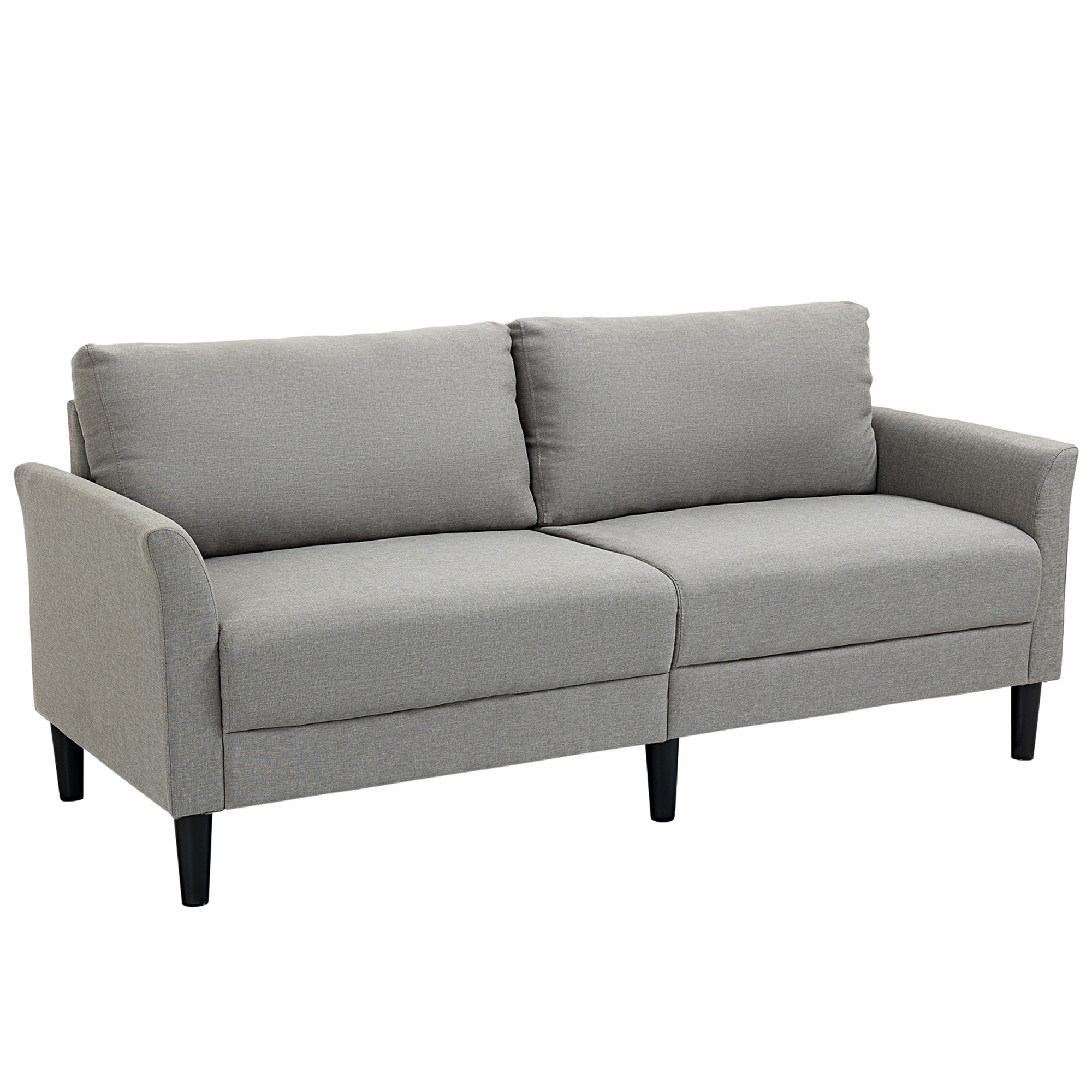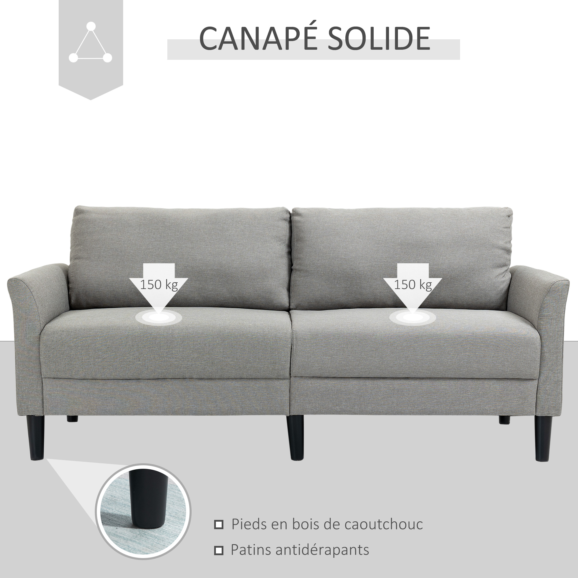 | Libellé | Canapé 2 places style contemporain assises larges profondes accoudoirs courbés piètement effilé bois hévéa noir polyester gris clair |