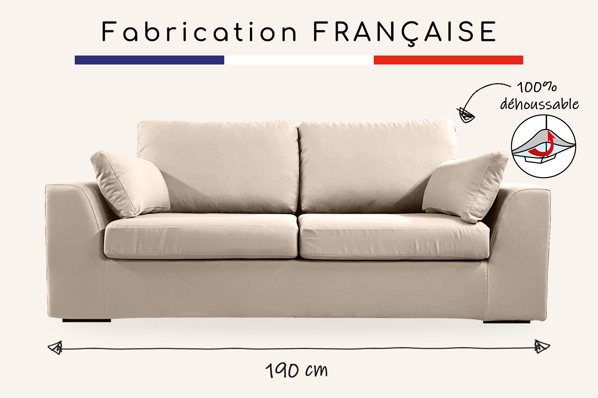 Plus produit - Confectionné avec amour dans le Nord de la France - Garantie 2 ans - 100% déhoussable pour un entretien facilité - Tissu naturel 100% coton - Confort et durabilité grâce aux mousses d'assise haute résillience 35kg/m3