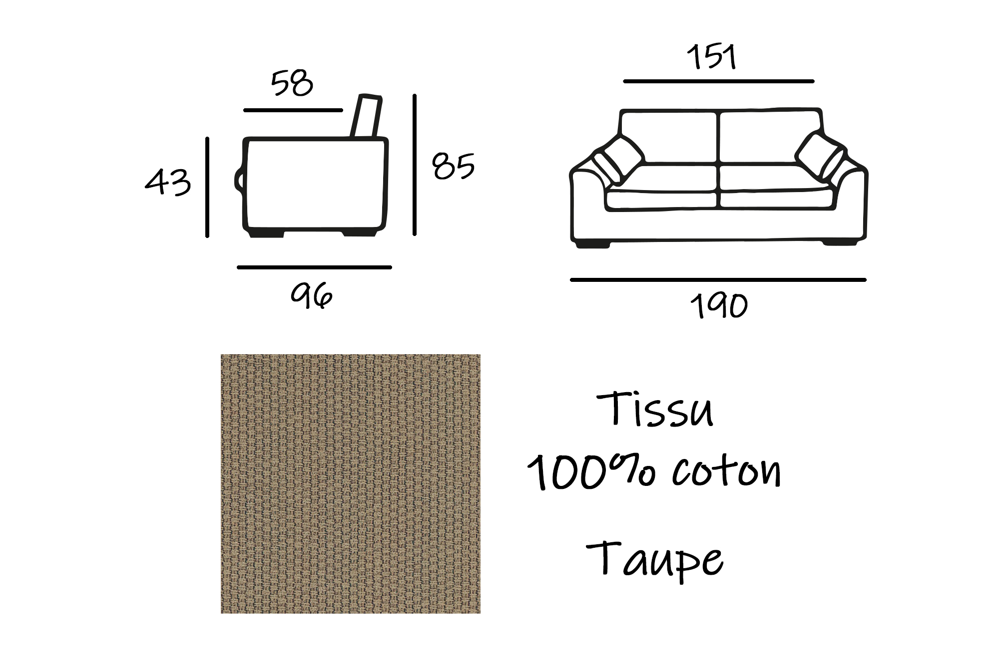 Libellé Canapé 3 pl TRESSIN 170 cm fixe tissu coton Taupe - 100% déhoussable - Fab. France