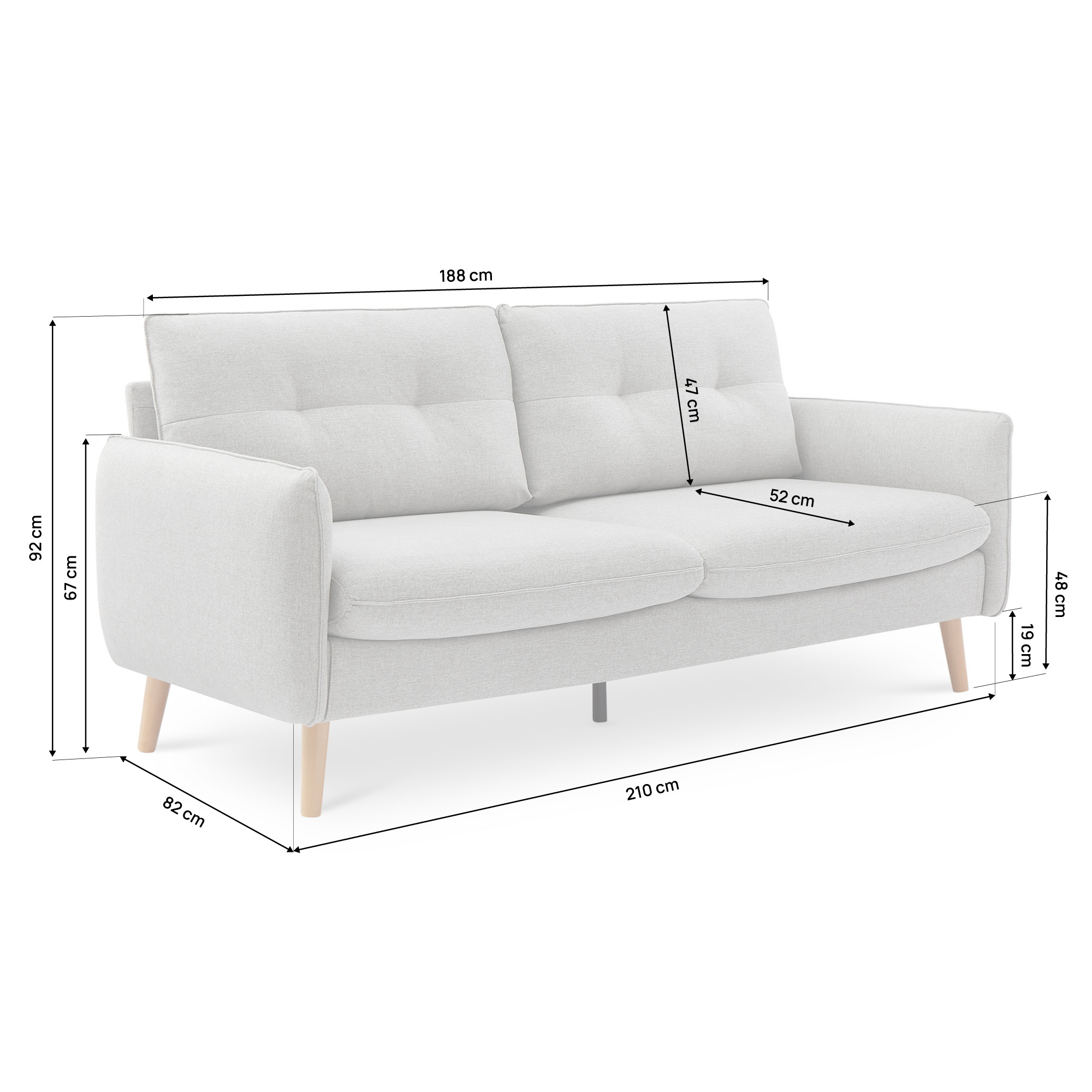 Trois assises spacieuses pour un confort optimal Élégance scandinave intemporelle Style intemporel du dossier capitonné Une structure solide en bois de qualité supérieure Produit livré en kit Sicaan, votre partenaire privilégié pour des fauteuils, canapés, et poufs en kit de qualité Collection CHLOE Envie d’une touche de modernité dans votre salon ? SICAAN vous présente la collection CHLOÉ. Conçus pour s'intégrer harmonieusement dans tout type d'intérieur, les produits de cette collection se distinguent par leur design scandinave épuré. Leur polyvalence et leur allure intemporelle en font un choix parfait pour tous les espaces de vie. Laissez-vous séduire par l’élégance et le confort de notre collection CHLOÉ. Le style scandinave à la pointe de la tendance Le style scandinave, en vogue depuis des décennies, continue d'être au sommet de la tendance en matière de décoration intérieure. Connu pour ses lignes épurées, il sait s’adapter à tout type d’espace. Les tons clairs, les textures douces et les touches de bois créent une atmosphère apaisante et accueillante. Le style scandinave est une option prisée pour celles et ceux qui recherchent une esthétique à la fois intemporelle et tendance. Le canapé droit : praticité et élégance pour tous les intérieurs Le design simple et épuré du canapé droit s’intègre harmonieusement à tout type d'intérieur, des espaces les plus restreints aux plus vastes. Sa forme rectiligne optimise l'utilisation de l'espace, permettant un agencement facile dans n'importe quelle pièce. Alliant à la perfection praticité et confort, le canapé droit trouve sa place dans tout espace de vie. Le tissu, la promesse d’un meuble durable Offrez à votre intérieur un meuble alliant élégance et durabilité avec notre canapé droit CHLOÉ en tissu. Apprécié pour sa solidité et sa résistance à l’usage quotidien, le tissu assure une facilité d’entretien et une durabilité remarquable. Il représente un choix fiable pour toutes les personnes recherchant un mobilier qui dure. Optez pour la fiabilité de notre canapé droit en tissu de la collection CHLOÉ pour un meuble tendance et durable. Nos conseils d’entretien Pour préserver le produit de la poussière, aspirer régulièrement le meuble. En cas de tache, frotter avec un chiffon humidifié d’un mélange de vinaigre blanc et d’eau, sécher avec un torchon et laisser sécher complètement avant utilisation. Afin de vous proposer des produits en kit, pratiques et faciles à transporter, les coussins sont compressés, ce qui peut les rendre froissés à la réception. Afin de restaurer la forme des coussins après leur réception, retirez-les de leur emballage plastique. Ensuite, malaxez-les pour répartir uniformément le garnissage. Laissez-les ensuite reposer pendant 24 heures pour retrouver leur volume initial. Vous pouvez également utiliser un défroisseur vapeur pour accélérer ce processus, bien que ce ne soit pas obligatoire.