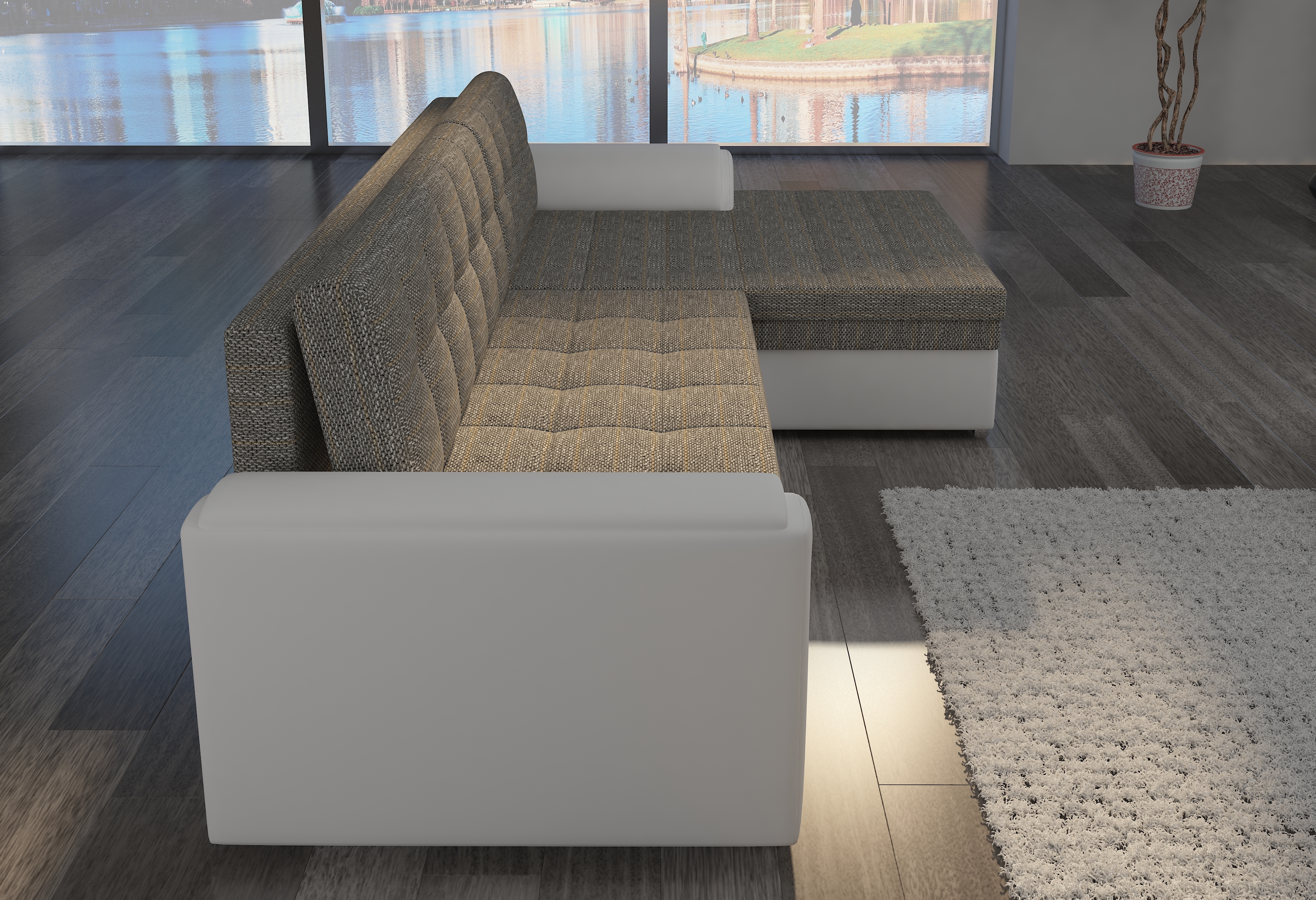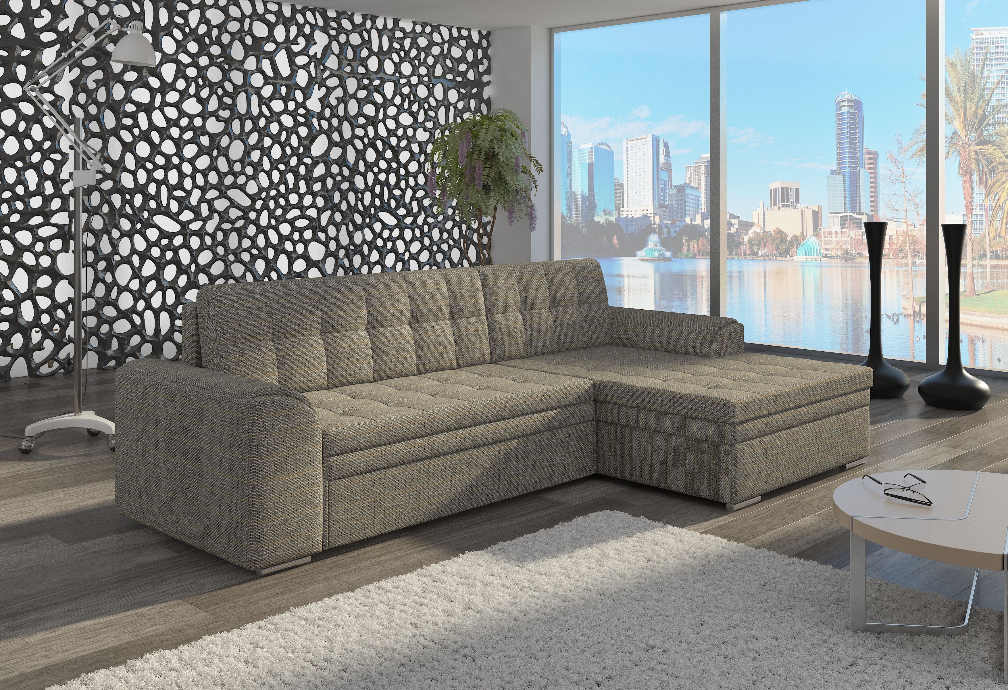 Canapé angle droit convertible tissu gris chiné Kapitona 270cm