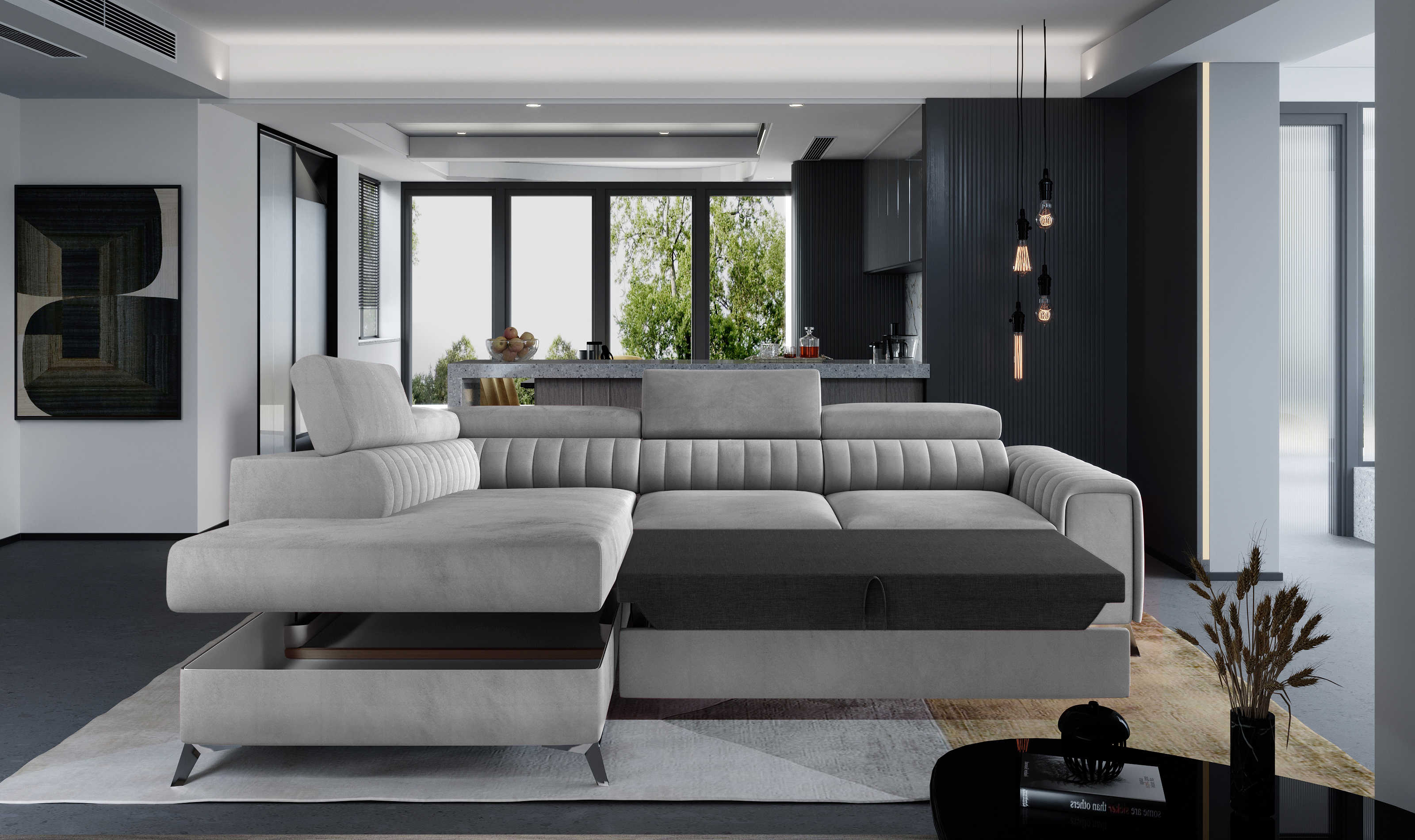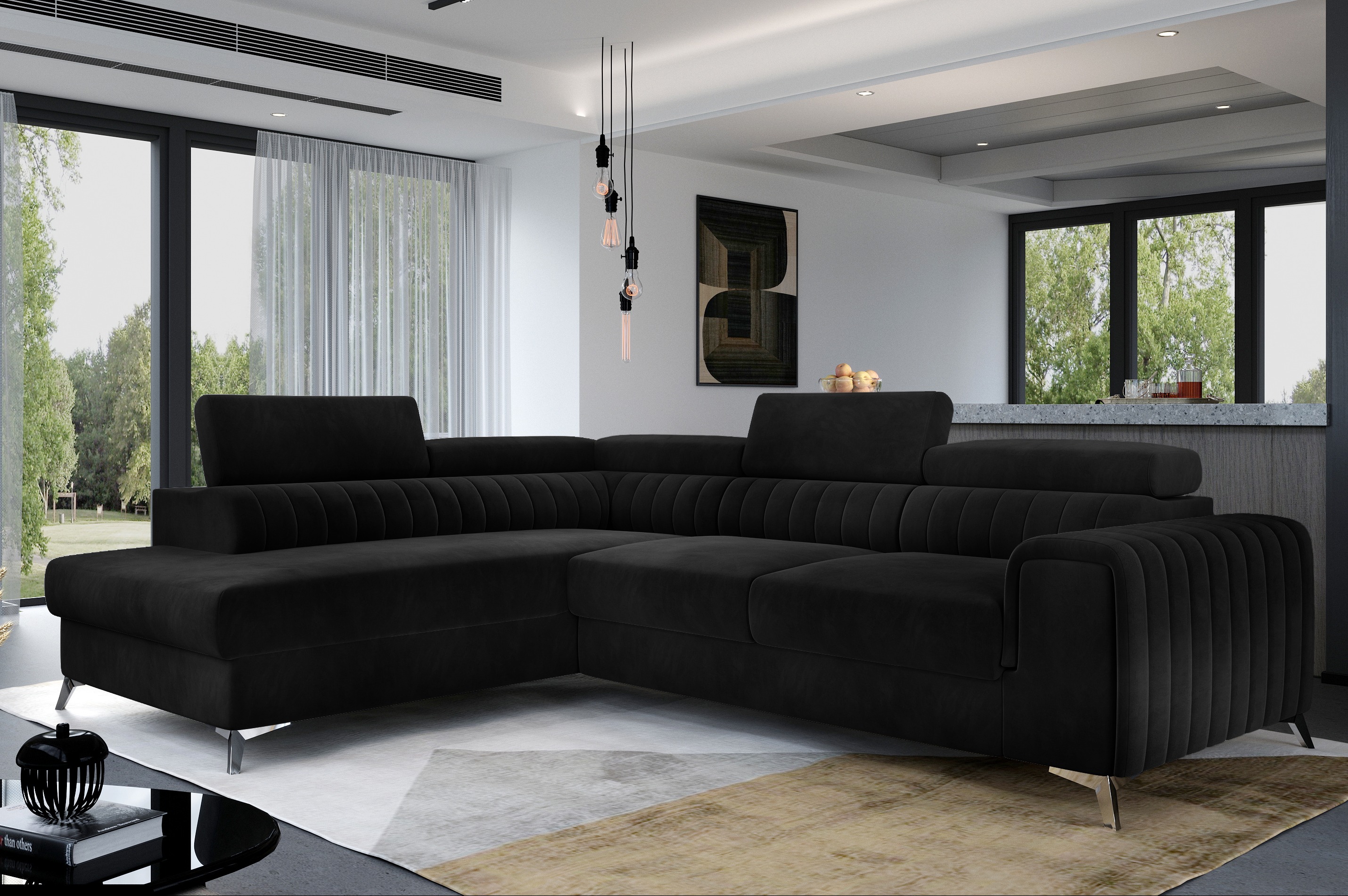| Libellé | Canapé angle gauche convertible avec appuis-tête réglables velours noir Lozan 275cm |