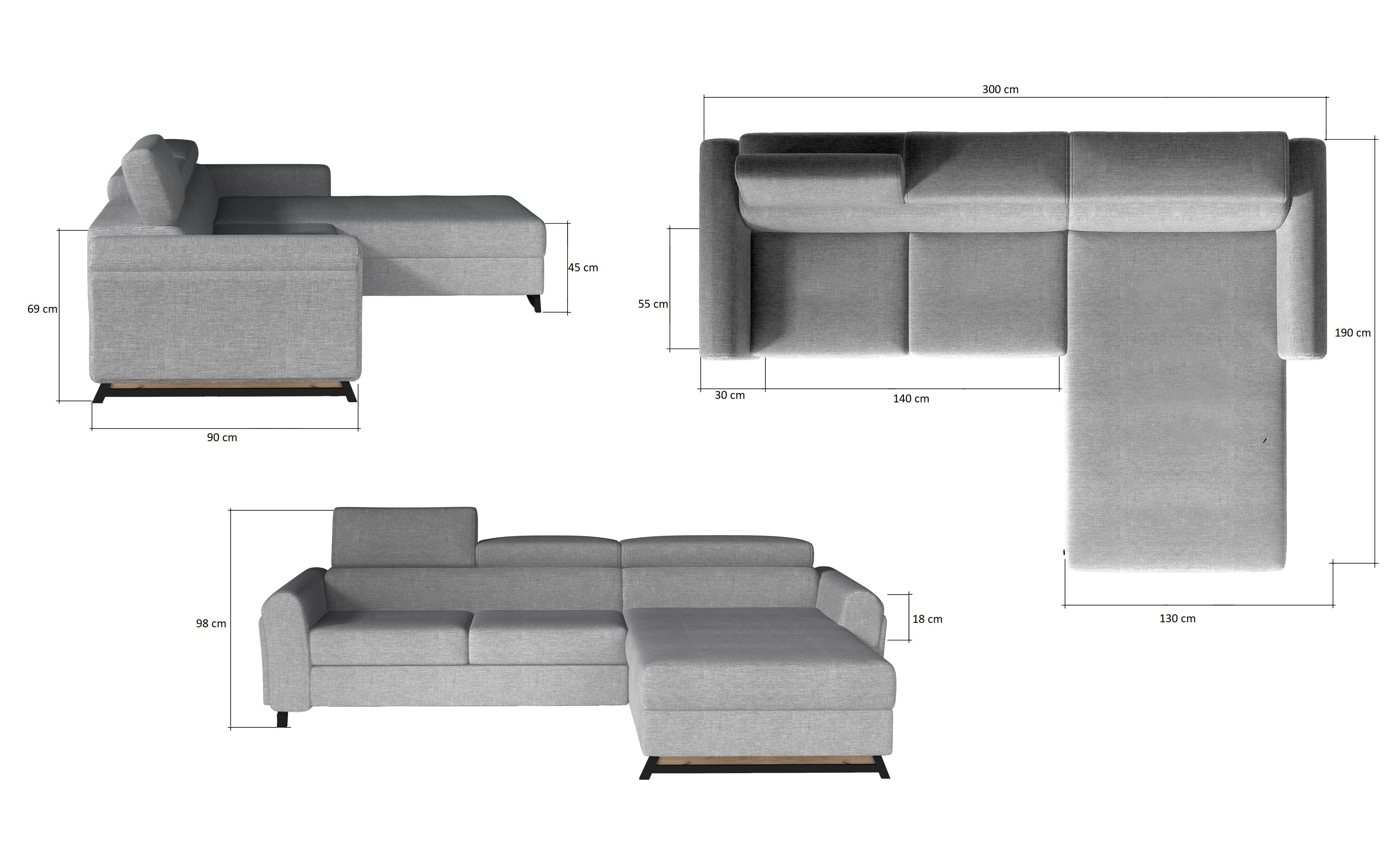 Coloris : beige Modele : 5 places Angle gauche ( quand vous êtes face au canapé la méridienne est à gauche) Largeur du canapé : 300 cm Méridienne gauche vue de face avec coffre de rangement : L 130 x P 190 cm Profondeur : 90 cm Profondeur d'assise : 55 cm Hauteur réglable: 98 cm - 3 têtières baissées 69 cm Hauteur d'assise : 45 cm Surface de couchage: 110x240 cm Poids : 159kg Revêtement : tissu italien haute qualité - 100% polyester - Garnissage poids : 330 g/m². - Résistance du revêtement à l'abrasion - Imperméable - Tissu inflammable et anti-taches - Traitement hydrofuge et anti-taches - Les coussins sont amovibles et déhoussables - Lavage en machine à froid 30° ou à la main Structure : Bois massif et panneau de particules Pieds métal noir et bois naturel: H 9 cm Matière et densité : - Assise : Mousse polyester 30 kg/m³ HR - Dossier et accoudoirs : 30 kg/m³ HR - Rembourrage : Ressort ondulé Mousse de haute qualité et hautement élastique Fabrication européenne - Garantie 5 ans 3 colis : 1. 202x125x75 76kg 2. 180x75x105 72kg 3. 107x18x17 9kg