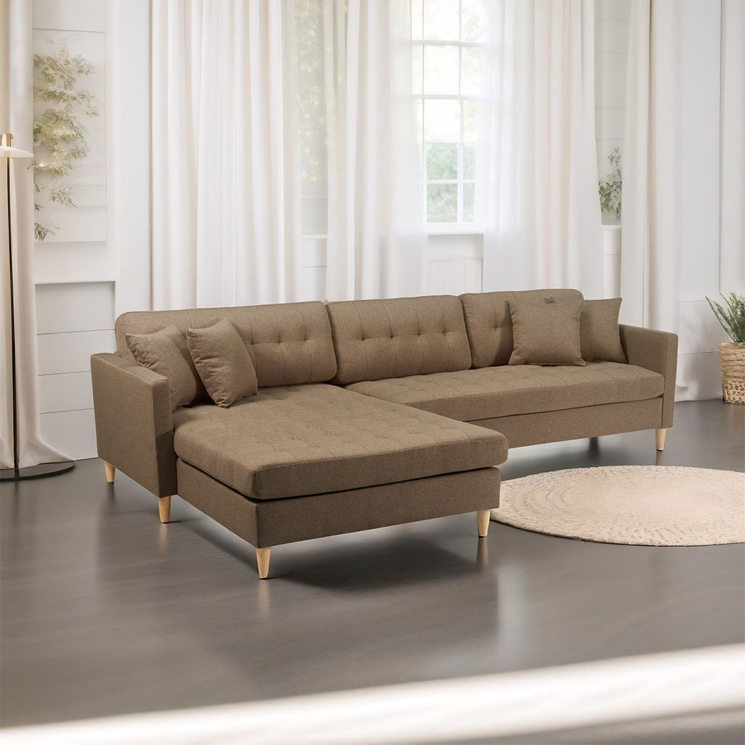Canapé méridienne Marino Deluxe orienté à droite ou à gauche incl. coussins tissu marron est un canapé Chaiselong de couleur marron, qui apporte à la fois style et fonctionnalité à votre maison. coussins en tissu marron. Ce produit est créé avec un souci du détail, ce qui garantit à la fois un attrait esthétique et une grande durabilité. Il est conçu dans un souci à la fois de fonctionnalité et de style, ce qui en fait le choix parfait pour n’importe quelle pièce de votre maison. Les matériaux utilisés sont de haute qualité, ce qui confère au produit une longue durée de vie et lui permet de résister à une utilisation quotidienne. Que ce soit pour le rangement ou comme ajout décoratif, ce produit rehaussera votre décor et apportera plus de confort et d'élégance à votre maison.