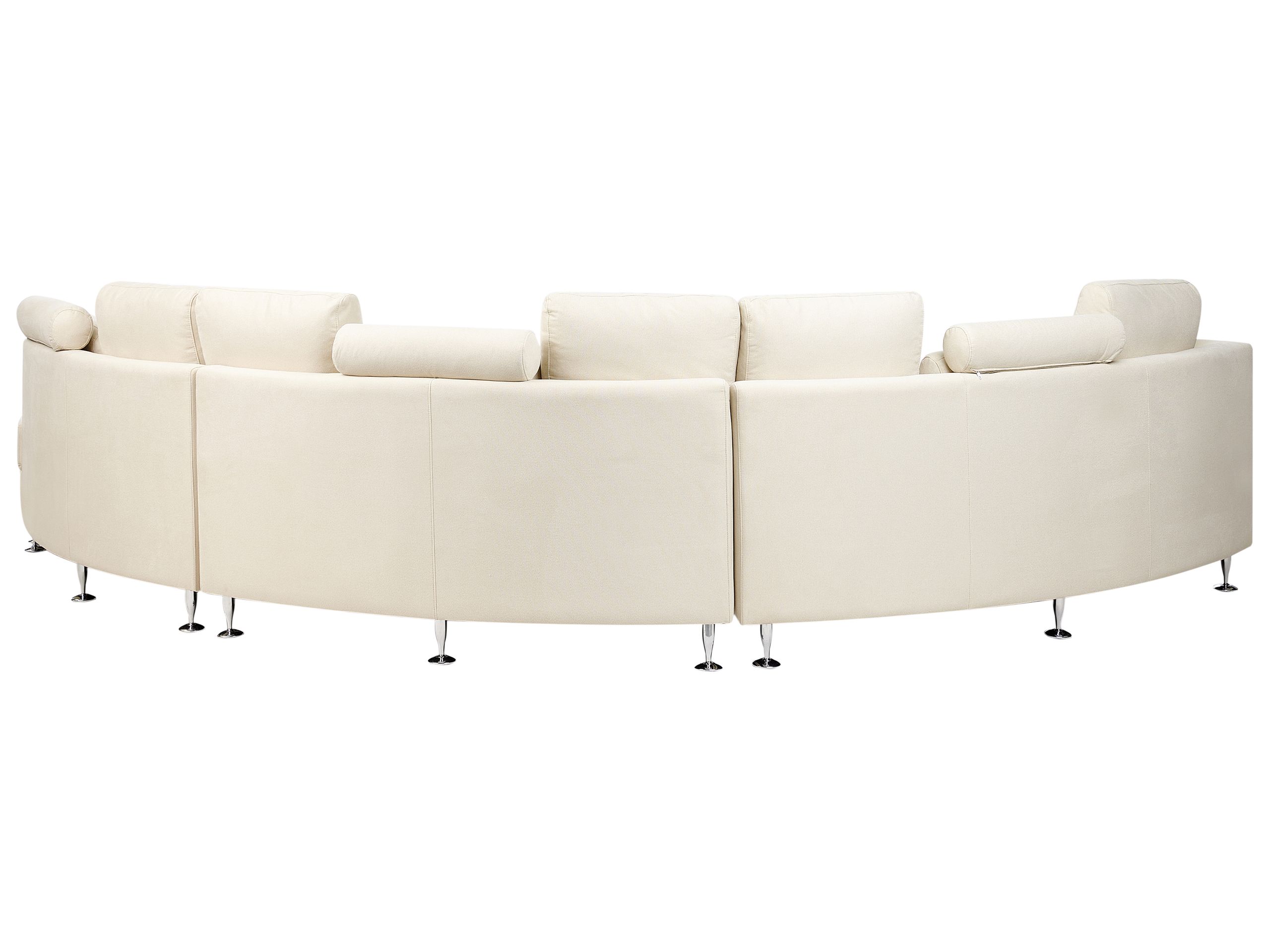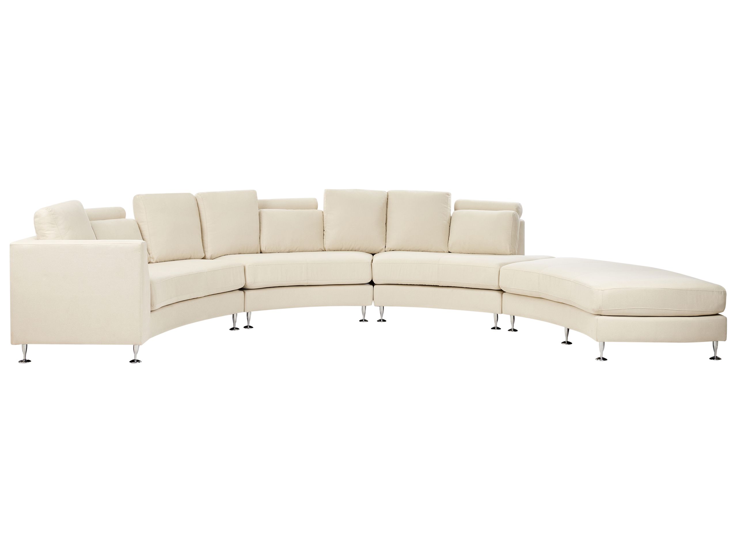 Canapé panoramique design rond en tissu beige avec pieds argent chromé. Apportez une touche de glamour à votre intérieur avec ce canapé semi-circulaire. La surface des sièges est recouverte de cuir de haute qualité, tandis que les autres parties sont en cuir PU doux au toucher. Le design et les sièges spacieux s'intègrent parfaitement à tout salon moderne ou contemporain. Les pieds en métal garantissent la stabilité et les coussins supplémentaires sont dotés de housses amovibles. L'ottoman inclus offre un siège supplémentaire.