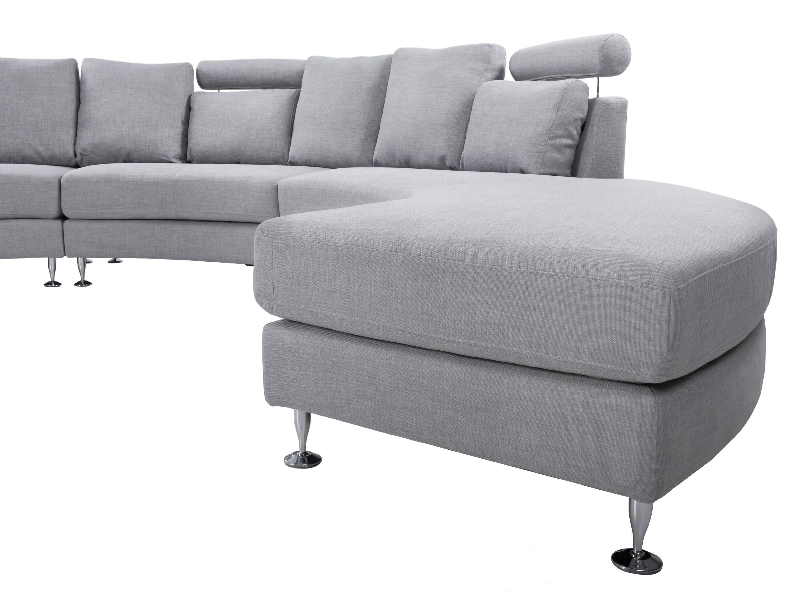 Canapé panoramique design rond en tissu gris clair avec pieds argent chromé. Apportez une touche de glamour à votre intérieur avec ce canapé semi-circulaire. La surface des sièges est recouverte de cuir de haute qualité, tandis que les autres parties sont en cuir PU doux au toucher. Le design et les sièges spacieux s'intègrent parfaitement à tout salon moderne ou contemporain. Les pieds en métal garantissent la stabilité et les coussins supplémentaires sont dotés de housses amovibles. L'ottoman inclus offre un siège supplémentaire.