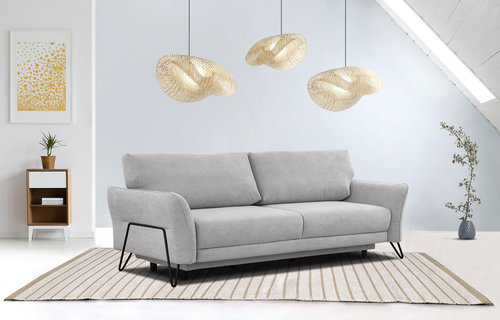 Voici un canapé exceptionnellement confortable et élégant qui s'intègre parfaitement à tout intérieur moderne. Doté d'une fonction convertible, il offre une grande surface de couchage pour deux personnes, idéale pour un usage quotidien ou pour accueillir des invités. De plus, avec son coffre de rangement intégré pour la literie, il offre un espace pratique pour stocker couvertures et oreillers, ce qui est très utile pour optimiser l'espace dans la maison. LOREM se distingue par son design moderne et industriel, qui ajoute du caractère à n'importe quelle pièce. Ses pieds métalliques non seulement ajoutent de la légèreté, mais confèrent également au canapé une élégance et un style uniques. Ainsi, LOREM n'est pas seulement un meuble, mais aussi un véritable élément de design pour votre salon ou votre chambre d'amis. LOREM n'est pas seulement un meuble, c'est aussi une manifestation de fonctionnalité et de style que vous ne pouvez pas ignorer. Offrez à votre maison une touche unique avec LOREM ! Dimensions: Longueur 237 cm Profondeur: 107 cm Hauteur: 93 cm Profondeur d’assise: 56 cm Dimensions de couchage: 193 cm x 147 cm