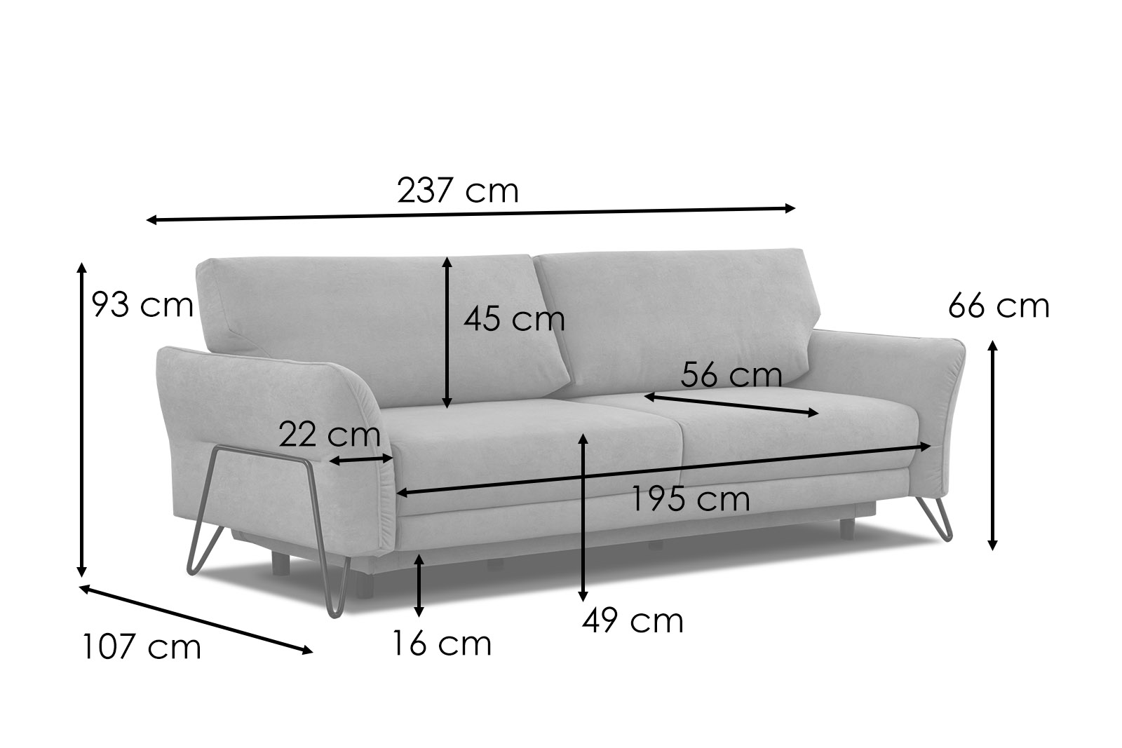 Voici un canapé exceptionnellement confortable et élégant qui s'intègre parfaitement à tout intérieur moderne. Doté d'une fonction convertible, il offre une grande surface de couchage pour deux personnes, idéale pour un usage quotidien ou pour accueillir des invités. De plus, avec son coffre de rangement intégré pour la literie, il offre un espace pratique pour stocker couvertures et oreillers, ce qui est très utile pour optimiser l'espace dans la maison. LOREM se distingue par son design moderne et industriel, qui ajoute du caractère à n'importe quelle pièce. Ses pieds métalliques non seulement ajoutent de la légèreté, mais confèrent également au canapé une élégance et un style uniques. Ainsi, LOREM n'est pas seulement un meuble, mais aussi un véritable élément de design pour votre salon ou votre chambre d'amis. LOREM n'est pas seulement un meuble, c'est aussi une manifestation de fonctionnalité et de style que vous ne pouvez pas ignorer. Offrez à votre maison une touche unique avec LOREM ! Dimensions: Longueur 237 cm Profondeur: 107 cm Hauteur: 93 cm Profondeur d’assise: 56 cm Dimensions de couchage: 193 cm x 147 cm