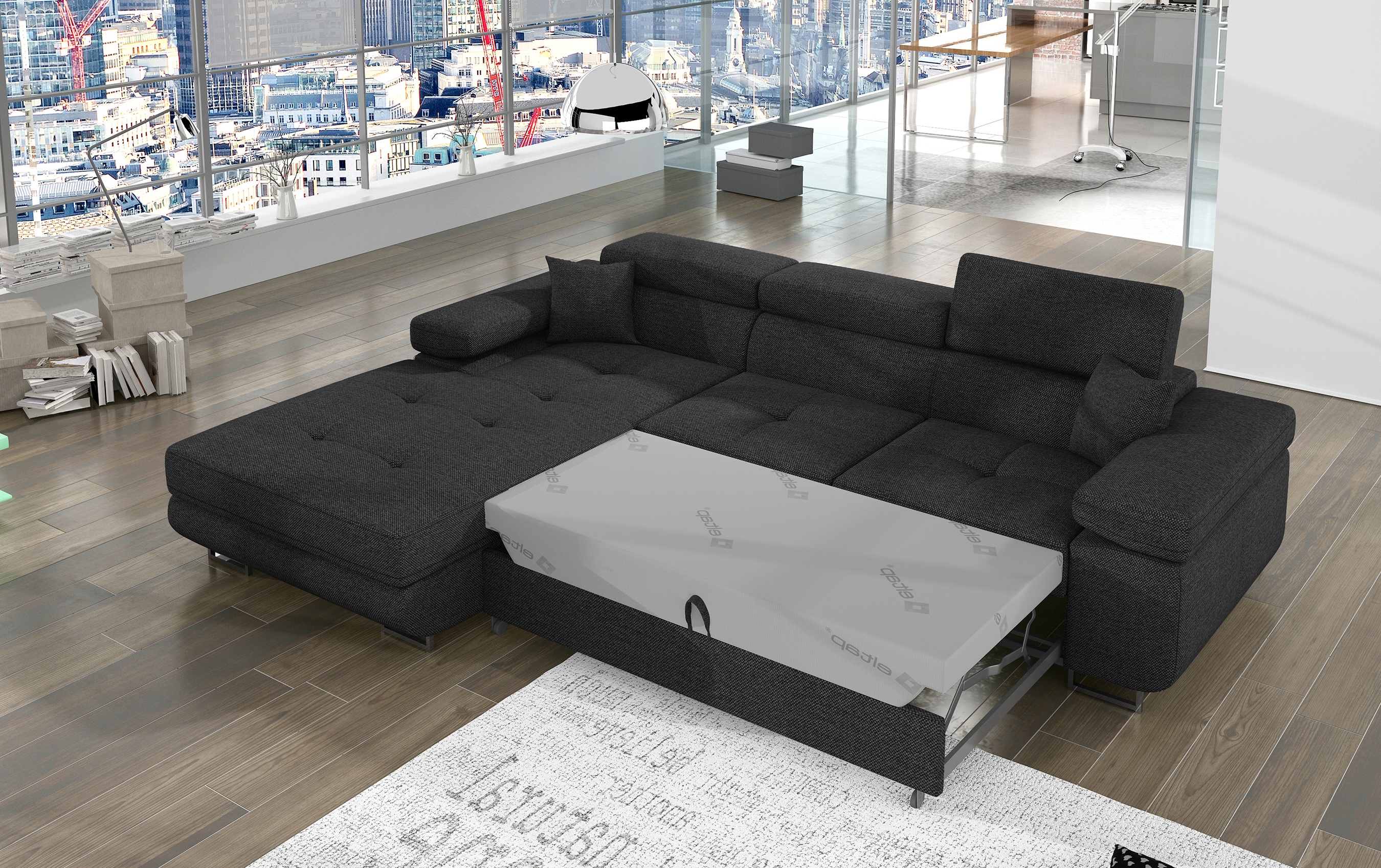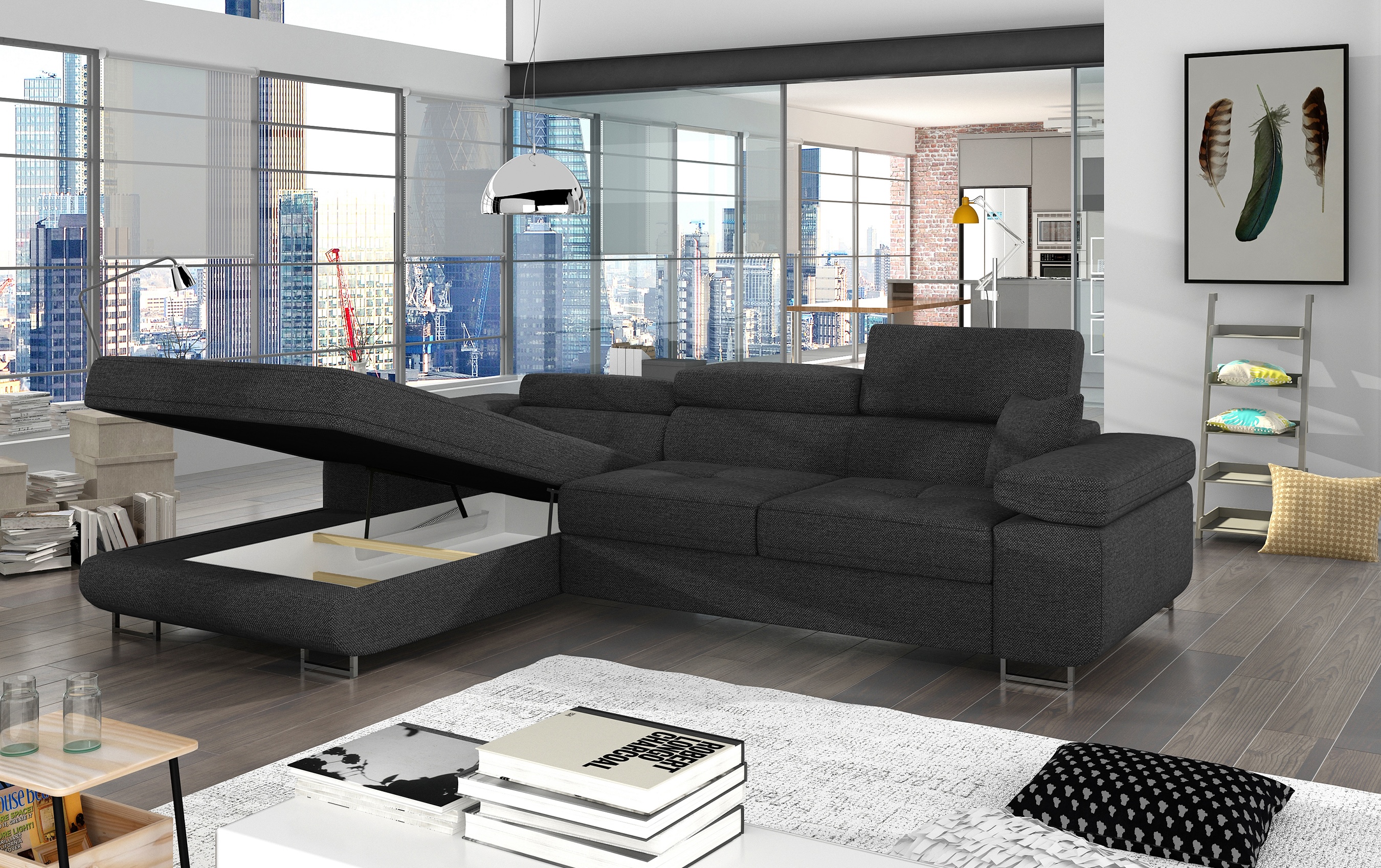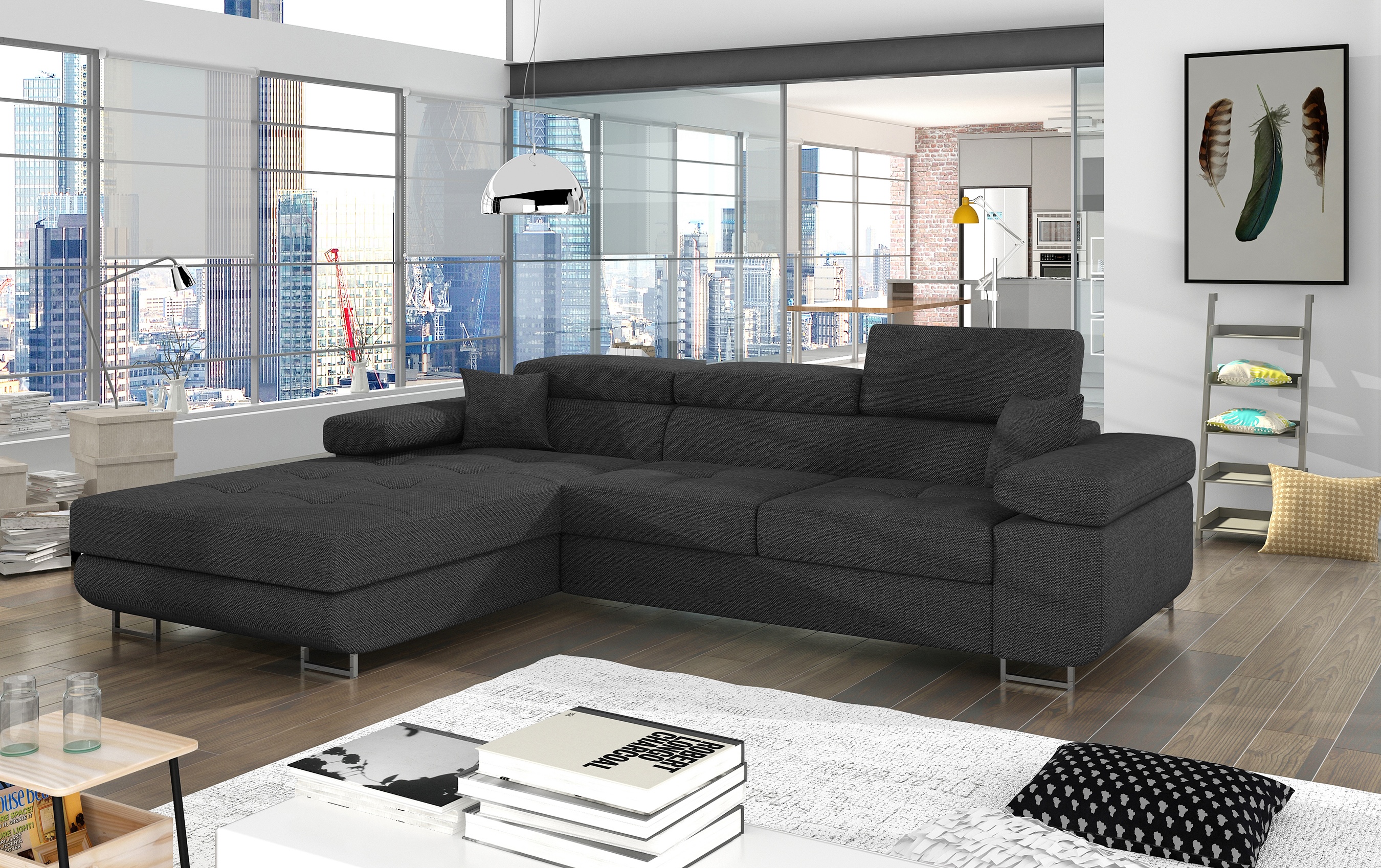 | Libellé | Canapé convertible d'angle gauche tissu gris foncé avec rangement Wile 280cm |