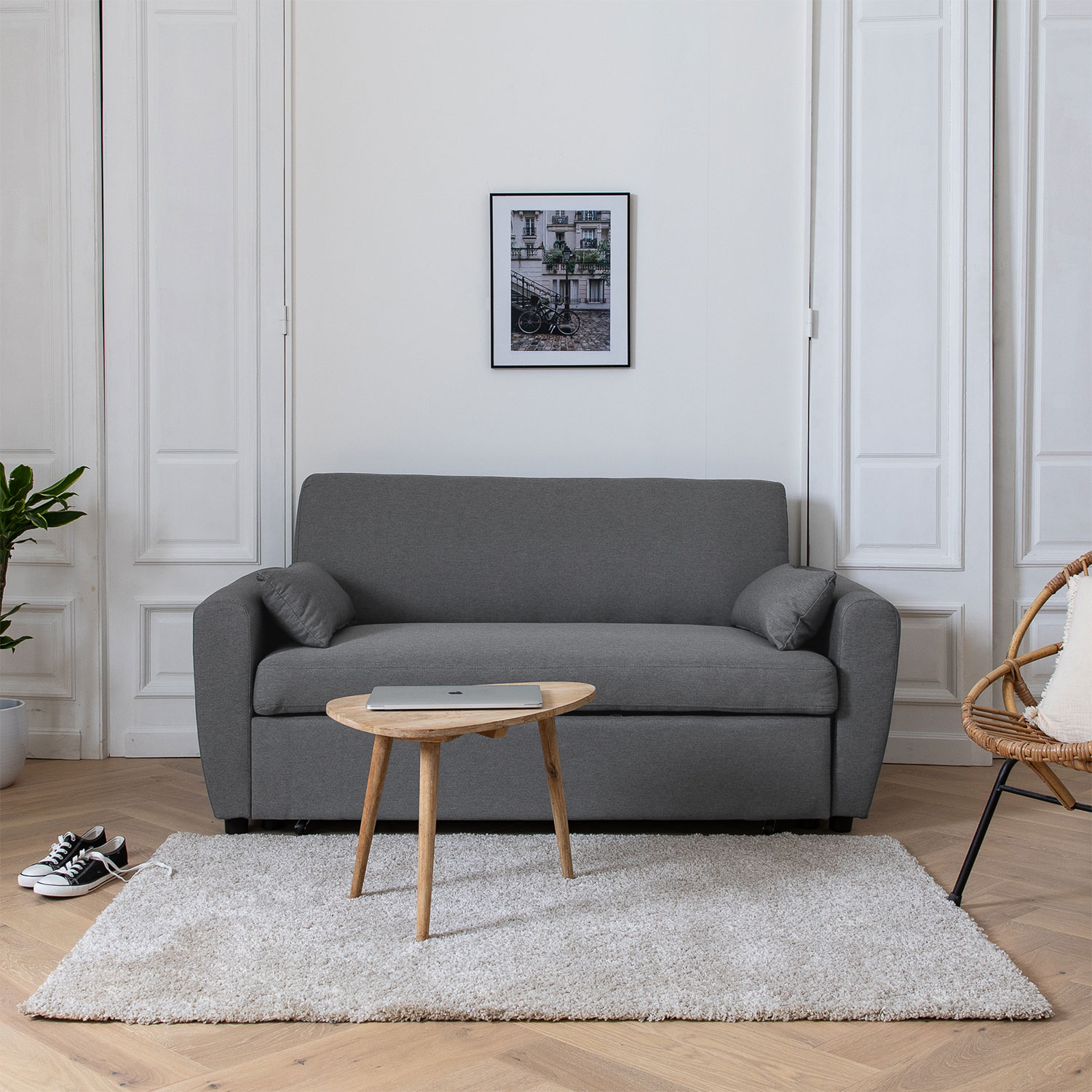 Vous n'aurez plus à vous soucier de recevoir des invités pour la nuit grâce à ce canapé convertible qui passe du sofa au lit de manière simple et rapide. Tirez simplement la poignée située sous l'assise et déployez le lit sans effort, dès que vous en avez besoin. Le modèle MATT a été fabriqué à partir de matériaux de qualité, avec du bois de bouleau et d'eucalyptus pour sa structure. Un revêtement en tissu complète son look qui s'accordera facilement avec votre style de décoration d'intérieur, quel qu'il soit. Ce canapé-lit 2 places est doté d'accoudoirs, d'un haut dossier et de deux coussins qui maximisent votre confort durant les moments de détente à la maison. Choisissez-le pour aménager votre salon.