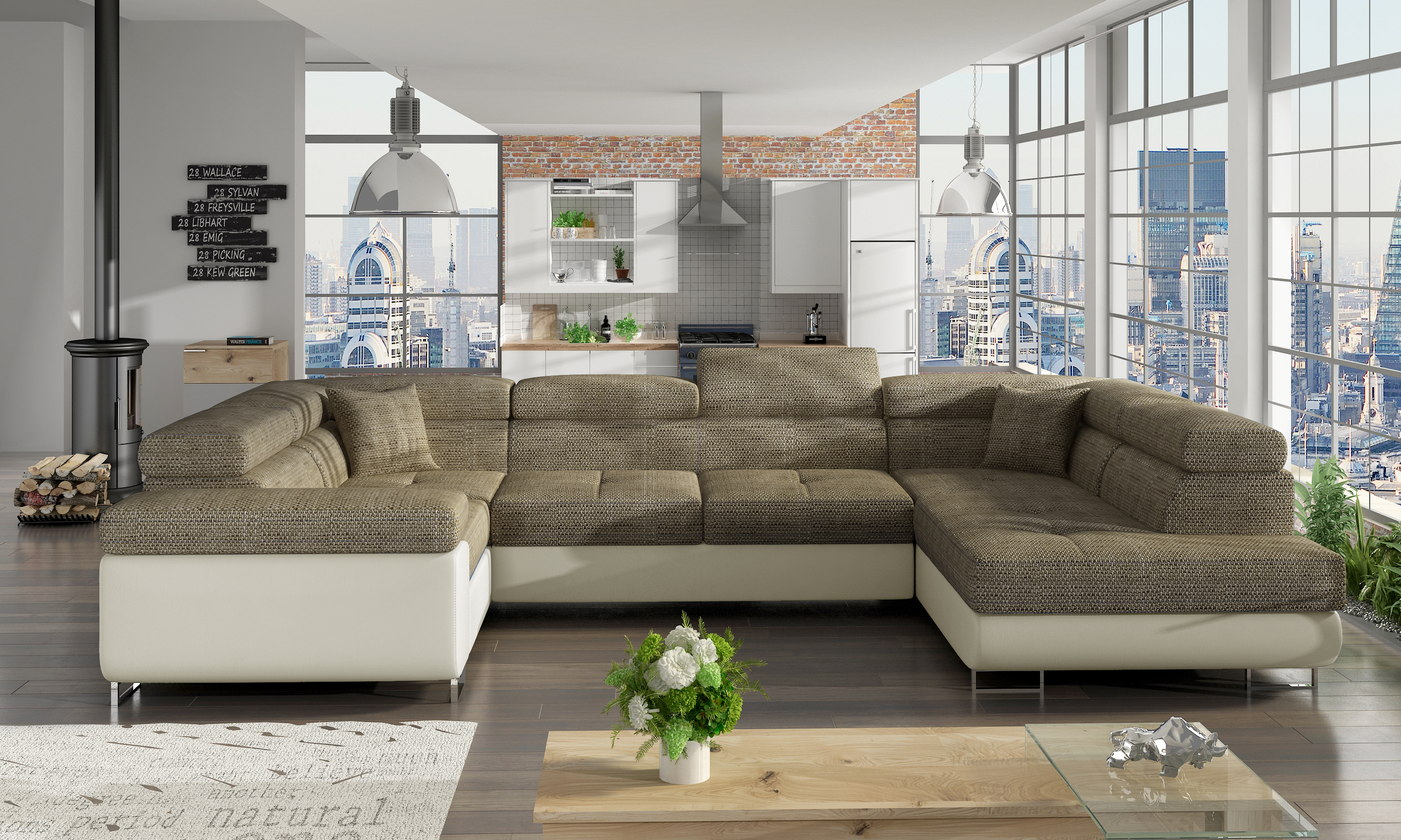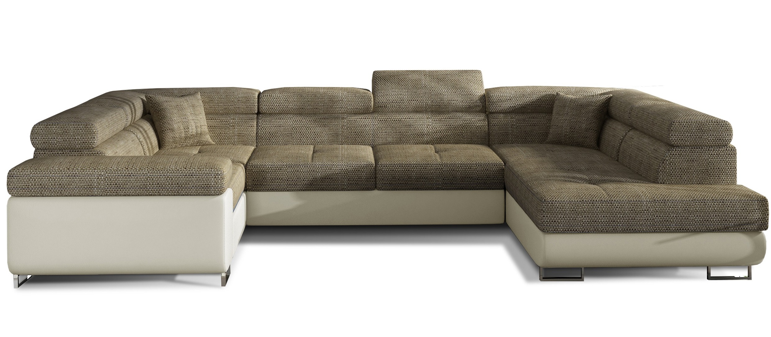 | Libellé | Canapé convertible U droit tissu beige chiné et simili crème avec coffre de rangement Tovy 340cm |