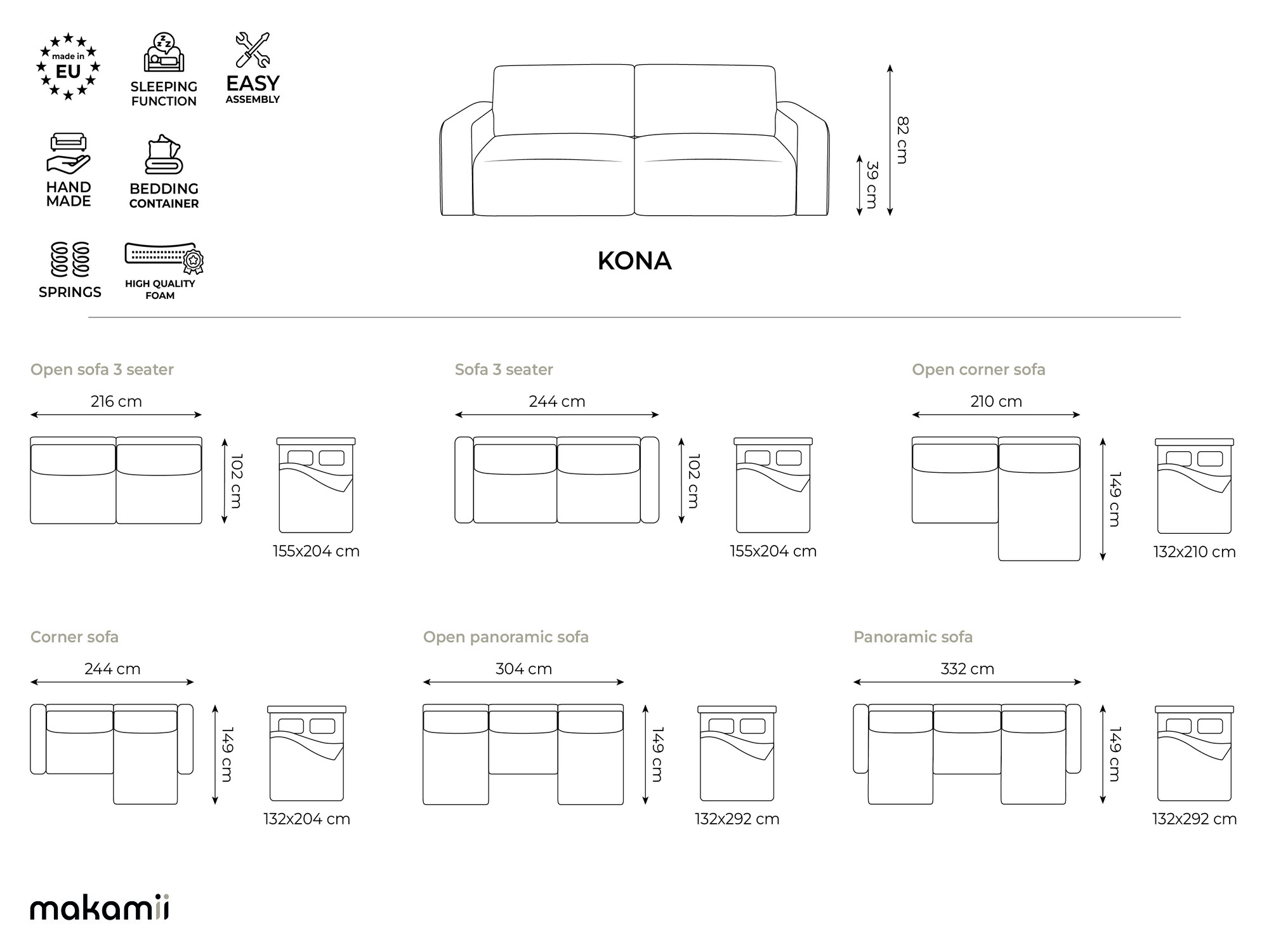 Le canapé d'angle droit Kona impressionne par ses lignes ouvertes et claires et ses dimensions 210 x 149 cm. Son design polyvalent sans accoudoirs donne à la pièce une atmosphère aérée et moderne, tandis que le coin salon généreux offre un espace pour 3 personnes - idéal pour les soirées sociales ou les moments de détente. Un point fort particulier est la fonction de couchage, qui transforme le canapé en un lit confortable avec une surface de couchage de 204 x 132 cm. En quelques étapes simples, il offre suffisamment d'espace pour les invités qui passent la nuit et les heures de détente. Le coffre de lit intégré offre un espace de rangement astucieux et offre de la place pour les oreillers, couvertures ou autres accessoires de maison afin que votre chambre reste toujours bien rangée. La construction robuste en bois de pin et panneaux renforcés garantit une stabilité impressionnante avec une capacité de charge allant jusqu'à 550 kg. Le rembourrage est composé de mousse polyuréthane résistante (30 kg/m³), complétée par des ressorts ondulés de type B, qui assurent un confort d'assise et une flexibilité optimaux. Les coussins de dossier en silicone et en mousse offrent un confort et un soutien supplémentaires. La housse en tissu structuré de haute qualité séduit par sa fine structure tissée qui donne au canapé un aspect moderne et tridimensionnel. Grâce au revêtement hydrophobe, les liquides s'écoulent simplement, ce qui facilite l'entretien et garantit la longévité du tissu. Avec une résistance à l'abrasion de 50 000 cycles Martindale, la housse reste en parfait état même en cas d'usage intensif. Les pieds en plastique noir assurent une stabilité supplémentaire et confèrent au canapé un look moderne et discret.