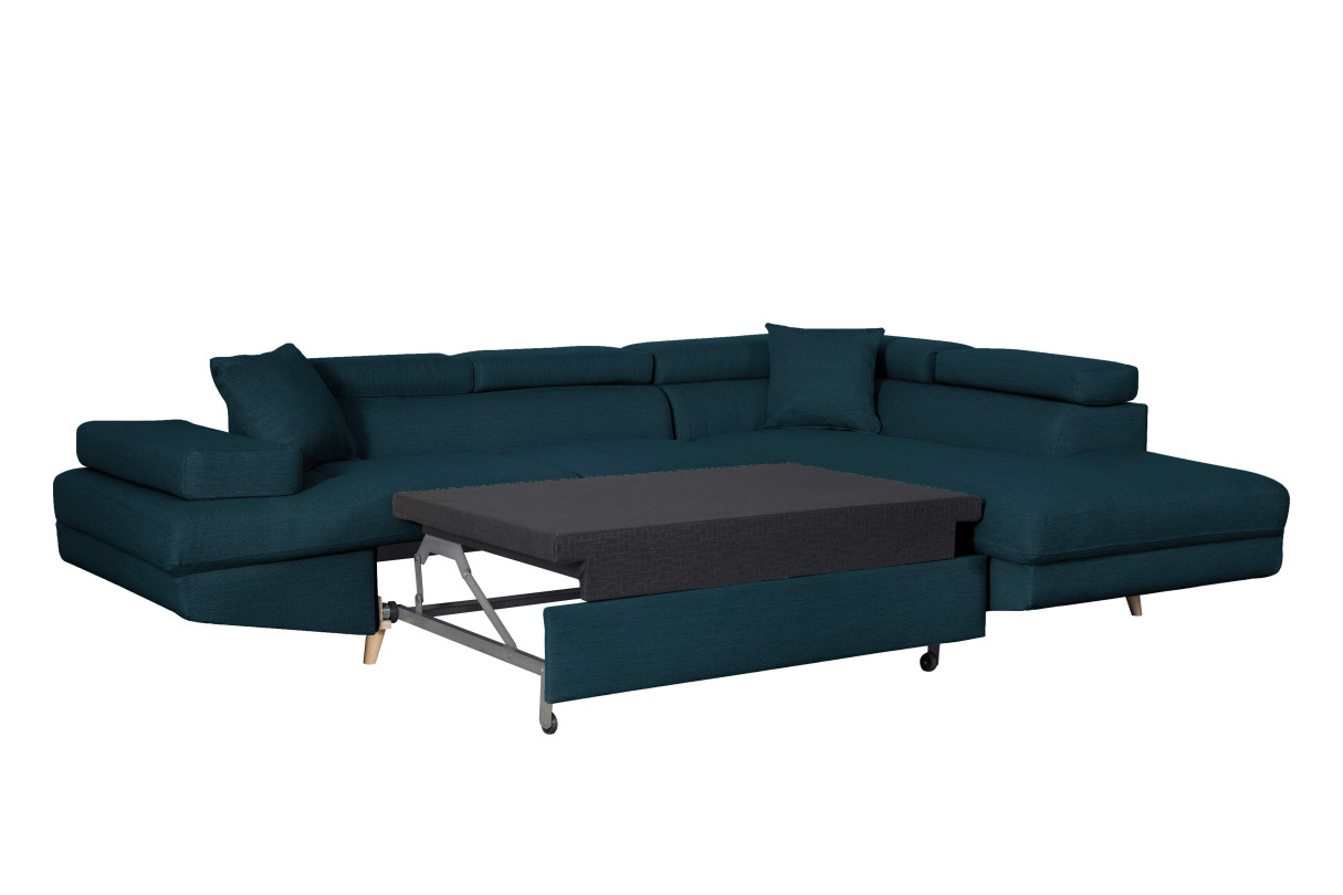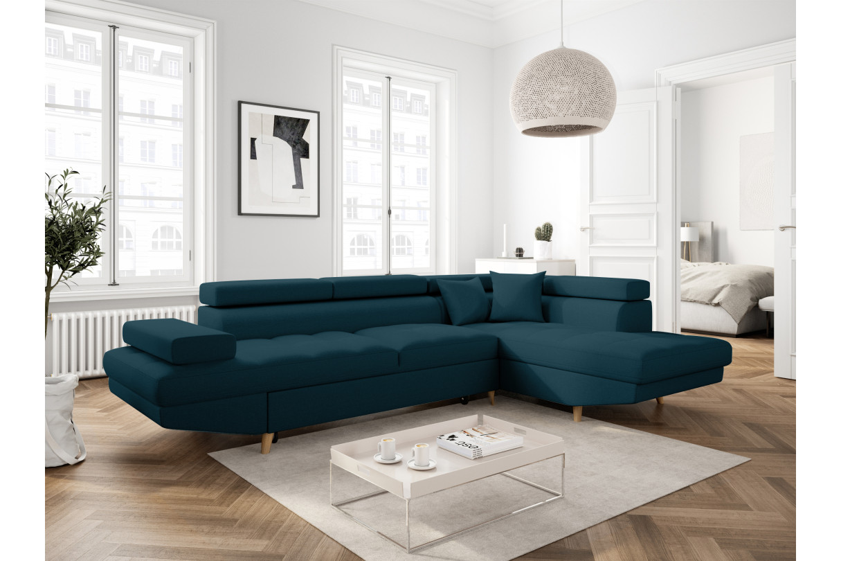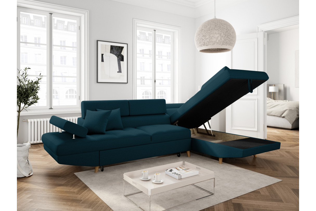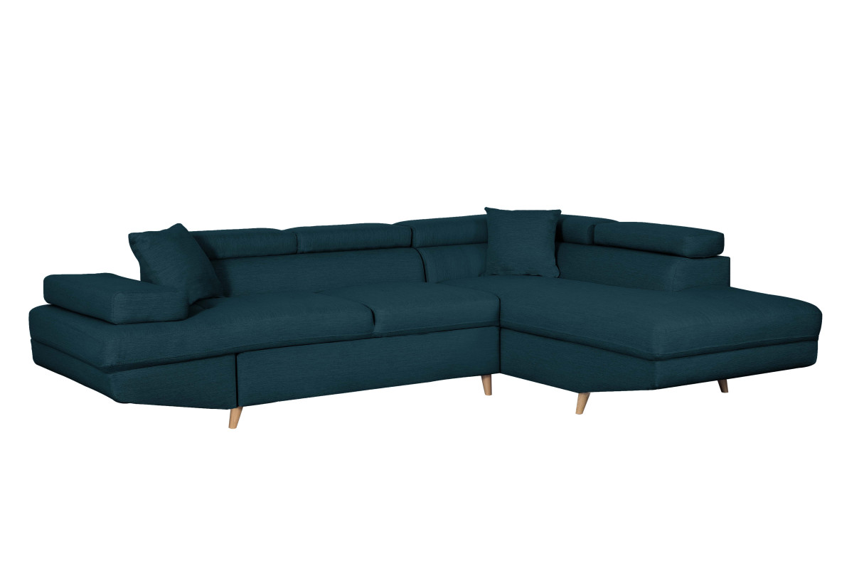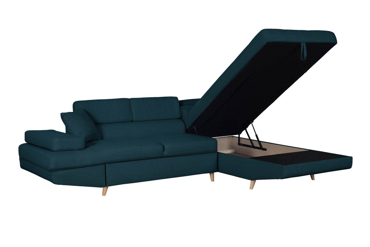 Canapé d'angle droit convertible RIO Scandinave avec coffre en tissu - Bleu, Pieds bois