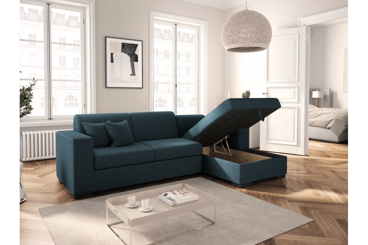 Canapé d'angle FUJI XL convertible avec coffre en tissu - Angle Droit, Bleu pétrole